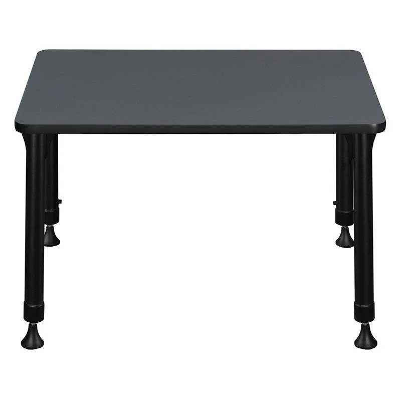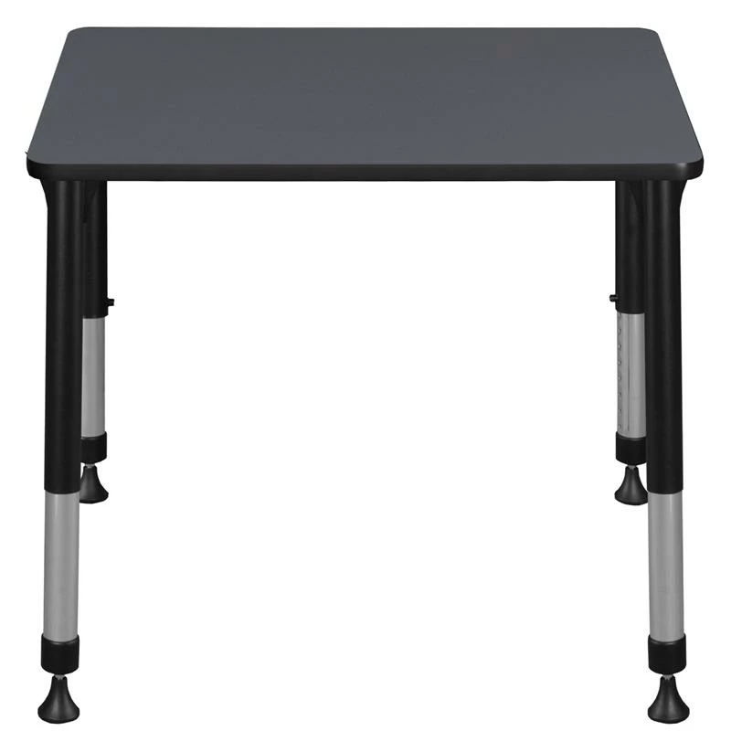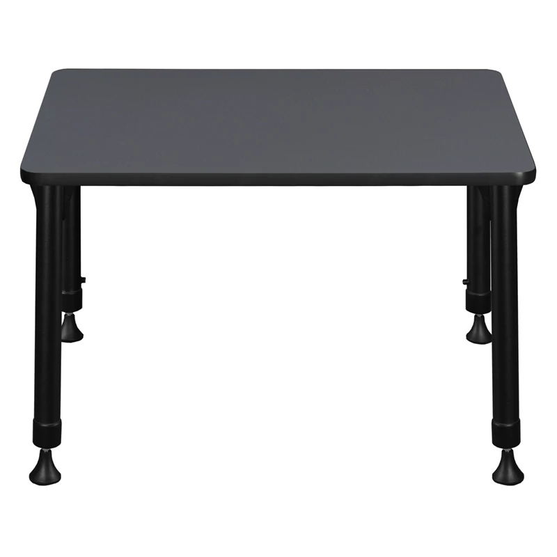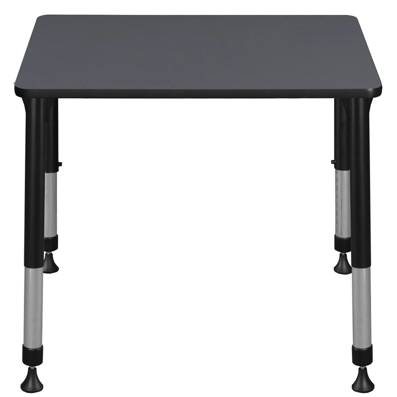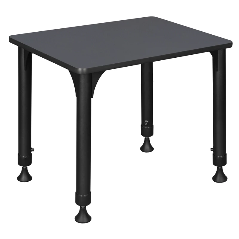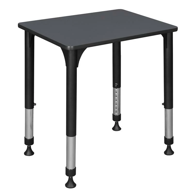 This Rectangular Height Adjustable School Desk is ideal for rooms with students of all ages. Kee adjustable post legs come four to a set and are height adjustable to accommodate students of all ages. Height is easy for adults to adjust by loosening and tightening a bolt with the included hex key. This 26-inch long and 18.5-inch deep student desk assembles in a snap with just a few screws. The desktop is constructed of a thermal fused melamine Grey laminate tabletop that is 3/4-inch thick and finished with a black edge band. Laminates are scratch, stain and scald resistant and wipe clean easily. Rounded corners make the table safer for everyone. A sleek alternative to pedestal style bases, the adjustable post legs come in a classic black with chrome underneath. Adjustable glides on the bottom of the base ensure a level desktop and are easy to adjust.
