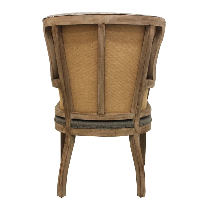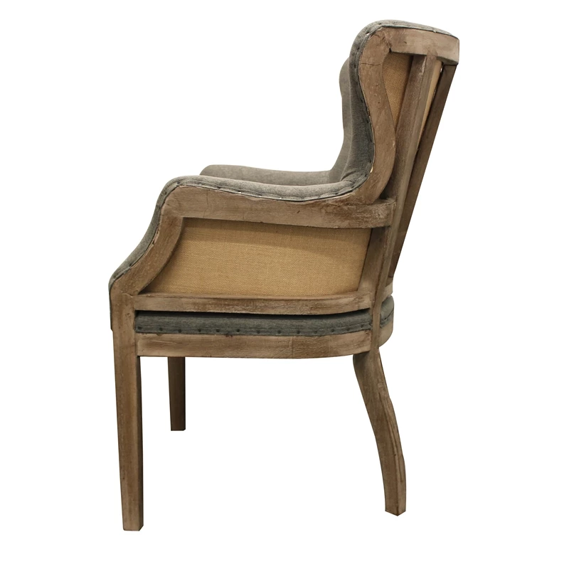 - Phil Exposed Wood Arm Chair Upholstered in Gray Fabric with Nail Tape Trim x 1