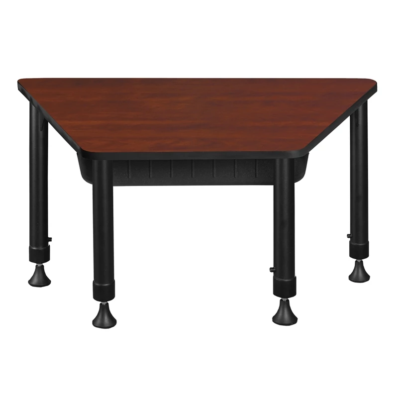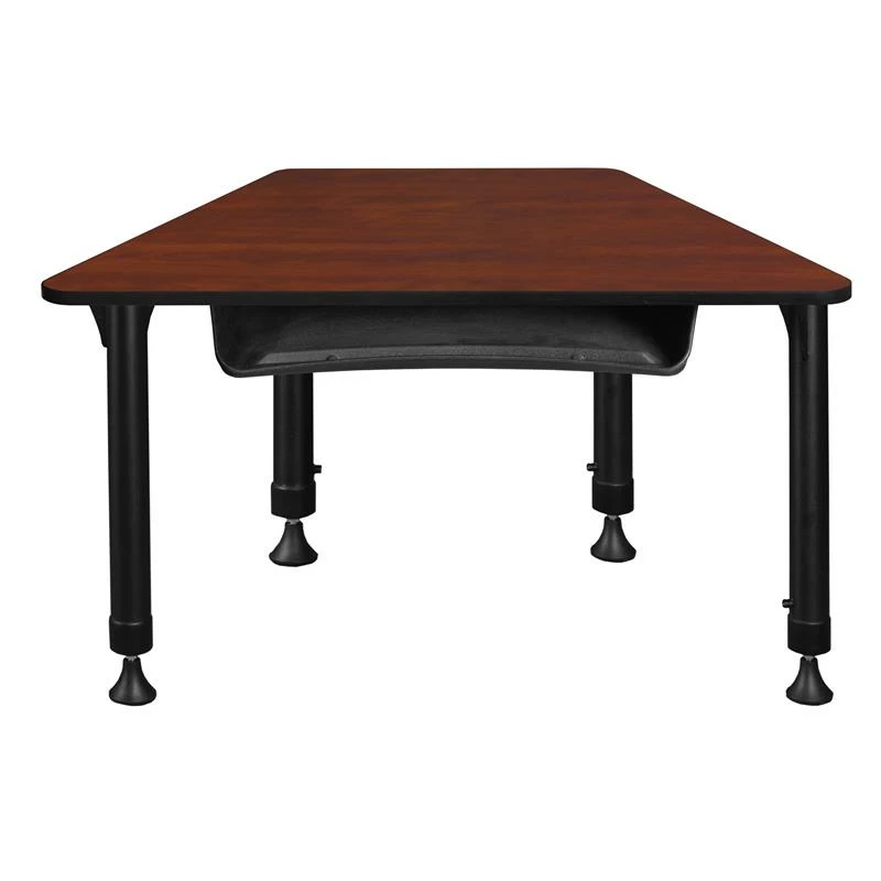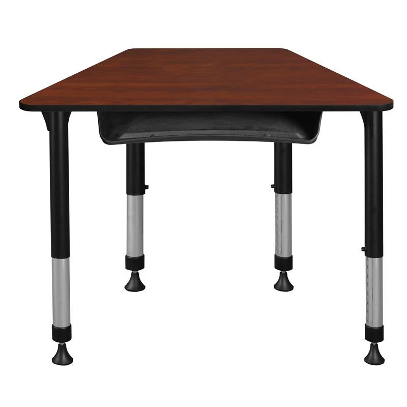 This Trapezoid Height Adjustable School Desk with book storage is ideal for rooms with students of all ages. Kee adjustable post legs come four to a set and are height adjustable to accommodate students of all ages. Height is easy for adults to adjust by loosening and tightening a bolt with the included hex key. This 36-inch by 23-inch student desk assembles in a snap with just a few screws. The desktop is constructed of a thermal fused melamine Cherry laminate tabletop that is 3/4-inch thick and finished with a black edge band. Laminates are scratch, stain and scald resistant and wipe clean easily. Rounded corners make the table safer for everyone. The added Book Box helps keep student desks or tables clutter free. Conveniently store textbooks, supplies or other classroom materials underneath the work surface. Mounts to the underside of virtually any wood surface. Interior Dimensions: 17″W x 12.5″D x 3.5″H . Accommodates most commonly used notebooks, binders and textbooks. A sleek alternative to pedestal style bases, the adjustable post legs come in a classic black with chrome underneath. Adjustable glides on the bottom of the base ensure a level desktop and are easy to adjust.