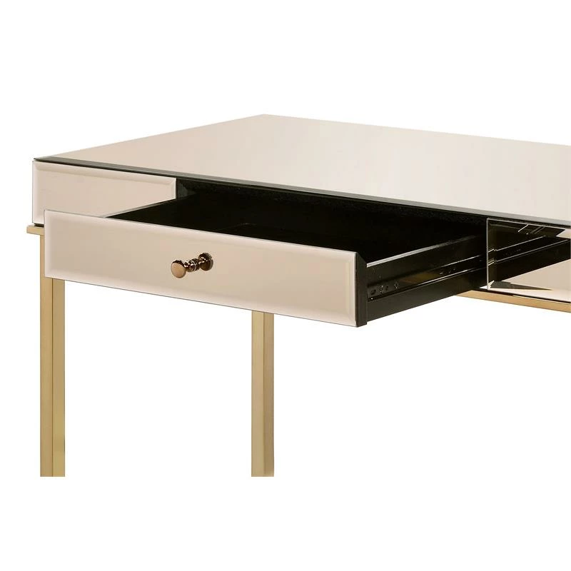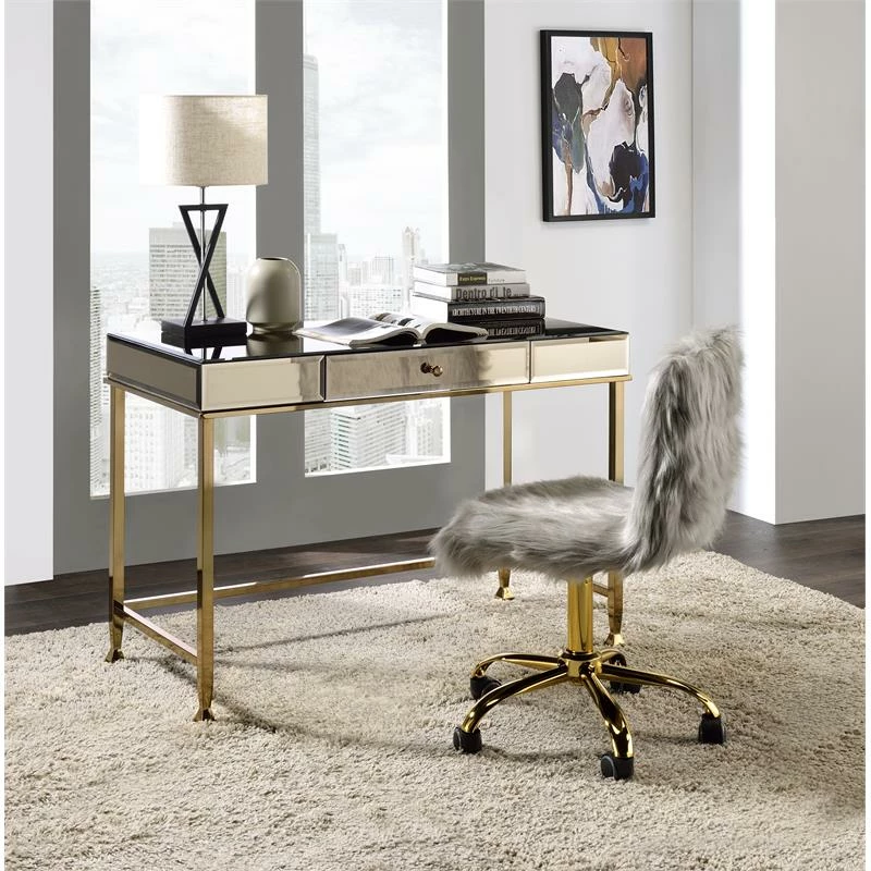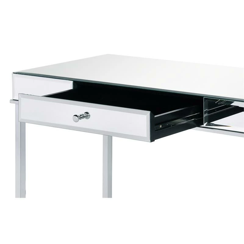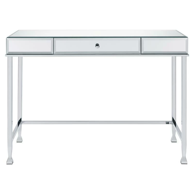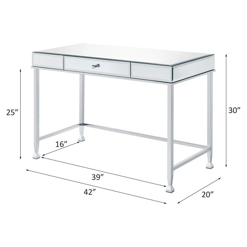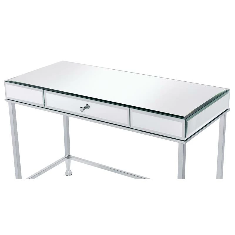 Let this contemporary reflective piece sparks your creativity and fuels your motivation. Mirrored desk top will beautifully reflect light from desk lamp to make your workplace feel brighter and even better. Chrome metal frame showcases an open silhouette and lustrous sheen, seamlessly complementing the sleek desk top. The desk is outfitted with a storage drawer for keeping your desk top organized and essential office supplies within reach.