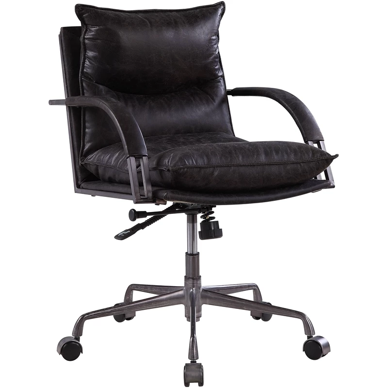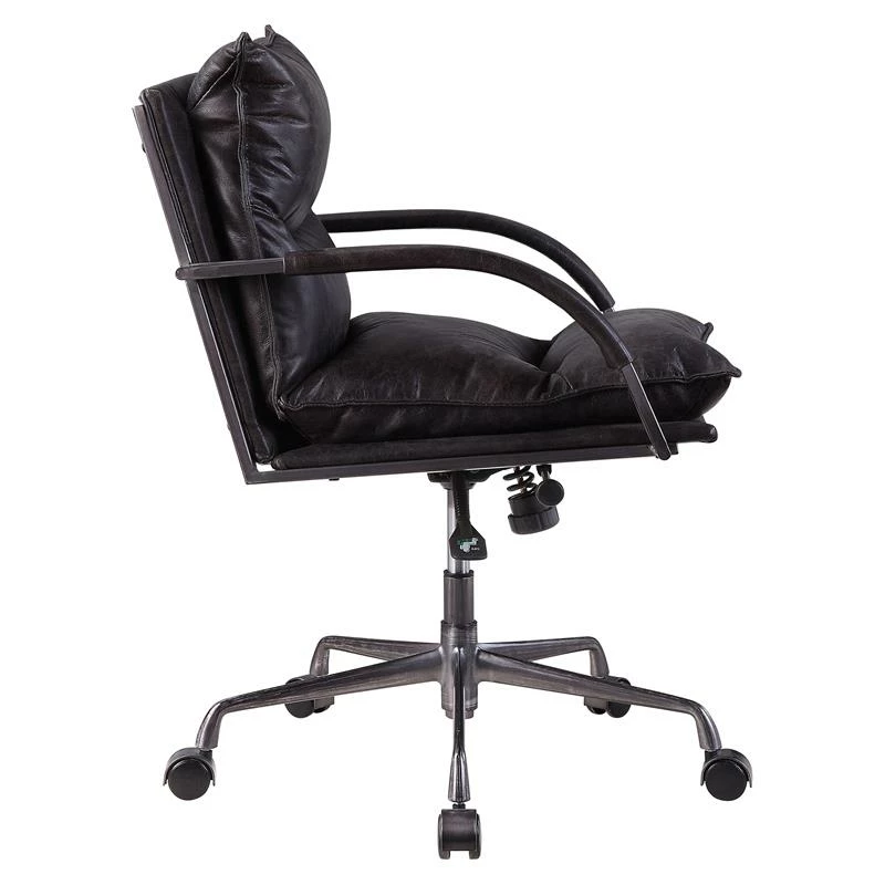 Make a bold statement with the Haggar executive chair. This executive office chair is the perfect mixture of industrial style and comfort. With a vast array of features such as casters, adjustable height, and a swivel seat, this chair is a must-have for any workspace. The top grain leather screams refinement. Boasting a high backrest that is perfect for lumbar support. Say goodbye to achy necks and backs. It is available in four color options.