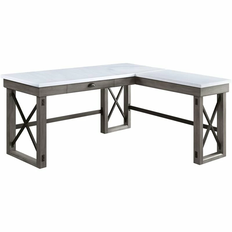 Infuse a dull and cold modern office with warm tone and cozy vibe. Space-saving corner design with lift-top storage and felt lined drawer maximizes office space utilization. The wooden desk features “L” shaped desk top on slatted base in a weathered gray finish that exudes comfort and casual elegance. ”X” shaped metal support adds extra style and durability to its design. Embrace this timeless transitional style that is applied to nearly any office.