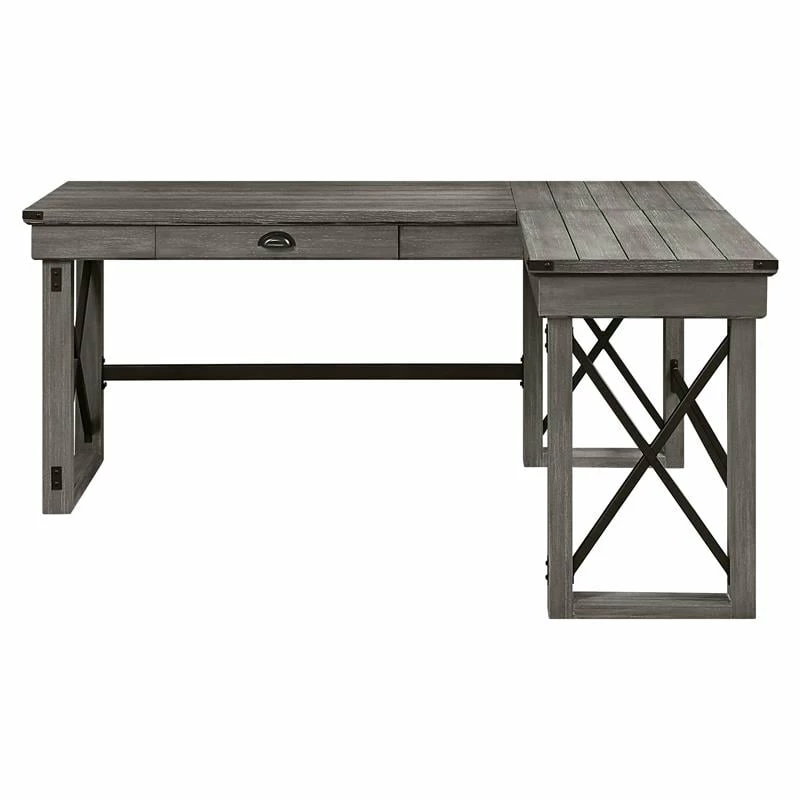 Infuse a dull and cold modern office with warm tone and cozy vibe. Space-saving corner design with lift-top storage and felt lined drawer maximizes office space utilization. Marble desk top on wooden slatted base in a rustic oak finish exudes comfort and casual elegance. ”X” shaped metal support adds extra style and durability to its design. Embrace this timeless transitional style that is applied to nearly any office.
