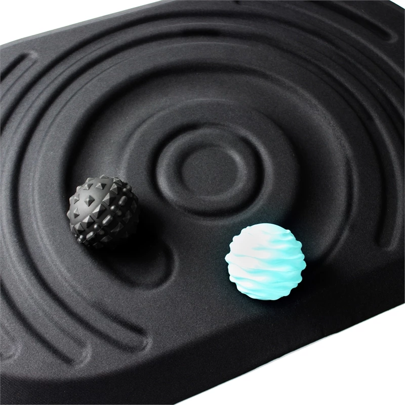 The ultimate anti-fatigue mat for active workplaces. Ergonomically designed to fight fatigue through regular small movements. This active anti fatigue mat has an surface which is both padded and supportive. Its design features deep contours and unique curves. The deepest curve on this mat houses two massage roller balls (included in the pack) which you can use to massage the soles of the feet and perform additional foot and leg movements -compared to traditional anti fatigue mats. The design of the Active Platform is based on a review of scientific evidence into the dangers of sitting for prolonged periods and the increased popularity of the standing desk. This mat has it all – it looks amazing, provides incredible anti-fatigue performance and gives unlimited foot massages! Buy one today to help make standing at work – especially at a standing desk – more comfortable and less tiring.