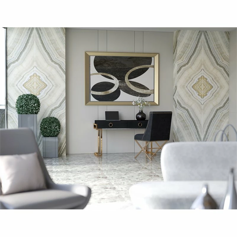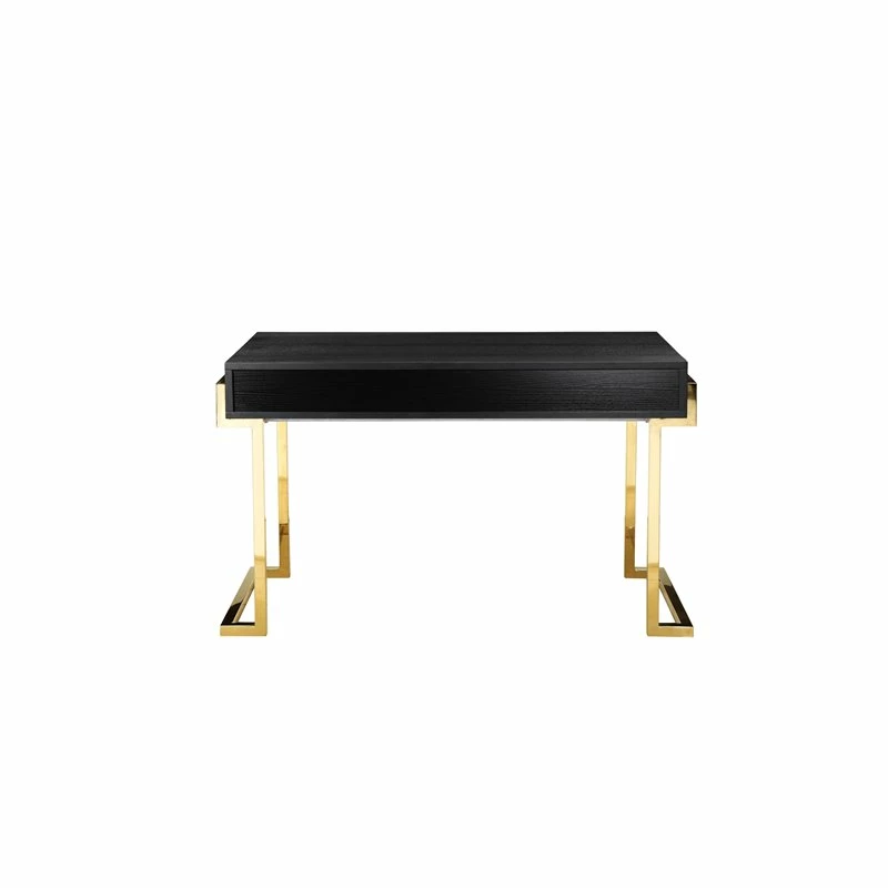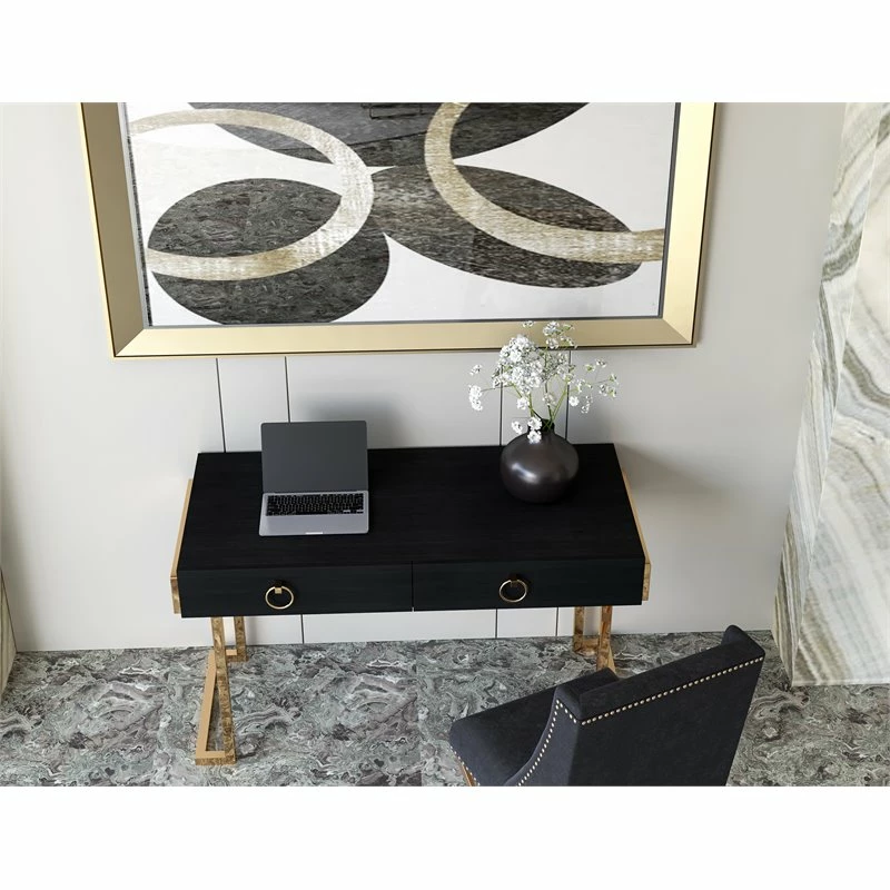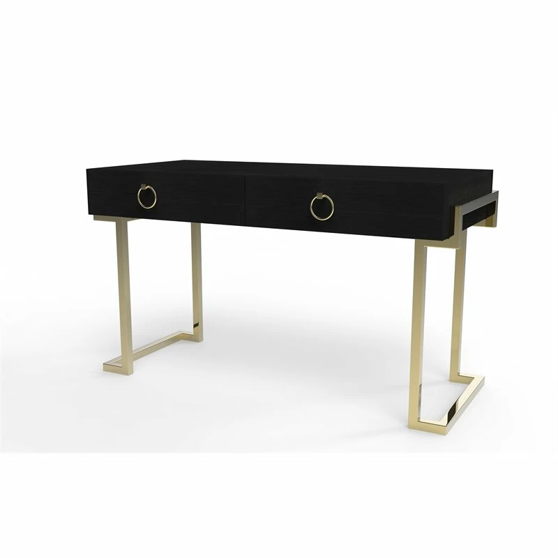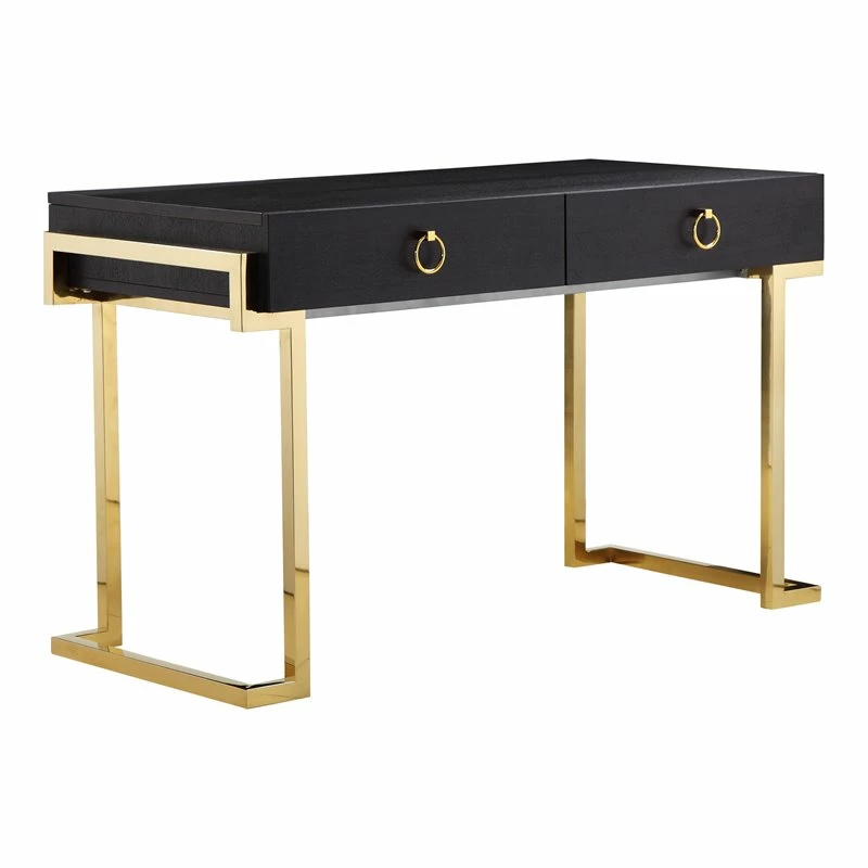 This desk is a stunning piece with a beautiful design that will quickly become the centerpiece of any space. Featuring two drawers for storage and beautiful gold hardware, this exquisite desk will illuminate your decor while easily serving its purpose.