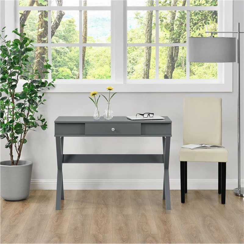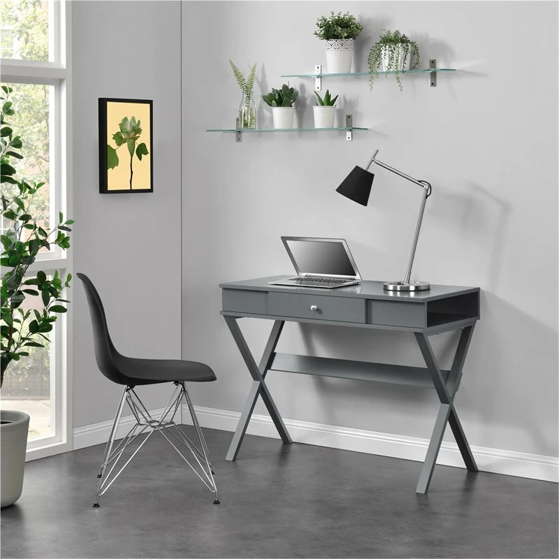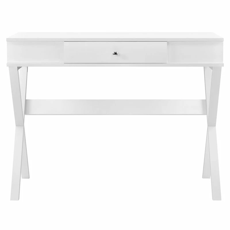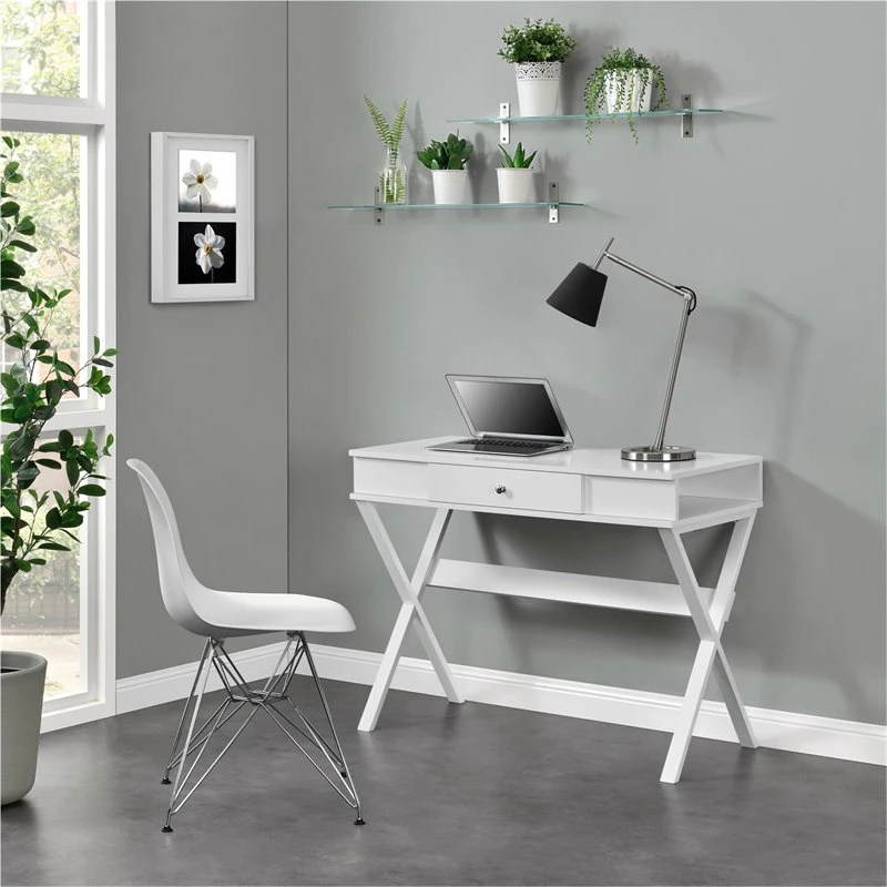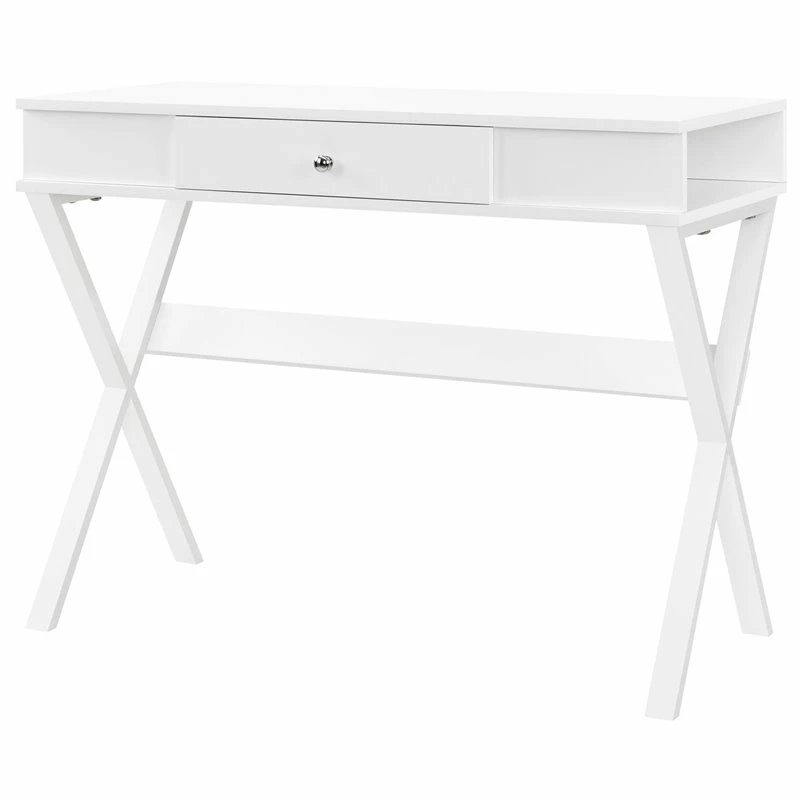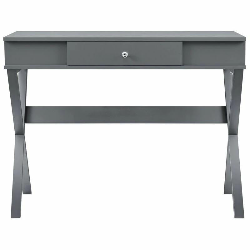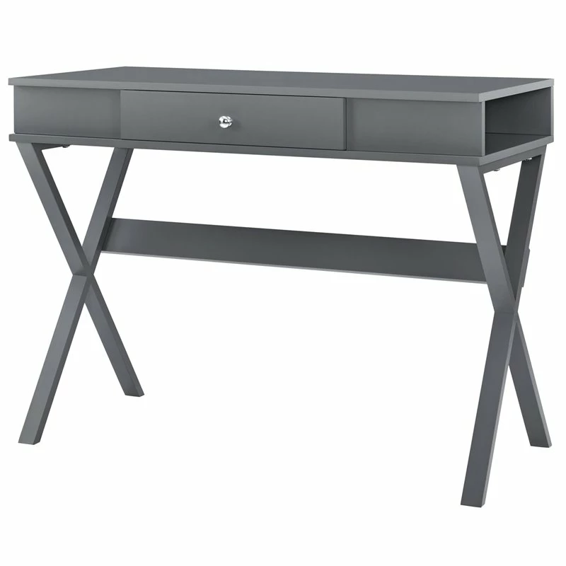 Enjoy the simple, yet sleek looking design of the Ameriwood Home Paxton Campaign Desk in the comfort of your home. This compact Desk works perfectly in a home office or smaller spaces such as dorm rooms and apartments. Use the smooth top surface to keep your laptop or write a paper on and the 2 side cubbies to place your phone or tablet for charging. Each side cubby has a wire management hole to easily plug in cords without all the tangled mess and a convenient center drawer is just the right size for notebooks, calculators and writing utensils. One of the best features of this fashionable desk is the fact that the top comes preassembled to make setup quick! Two adults should help with the assembly of this unit for best results.