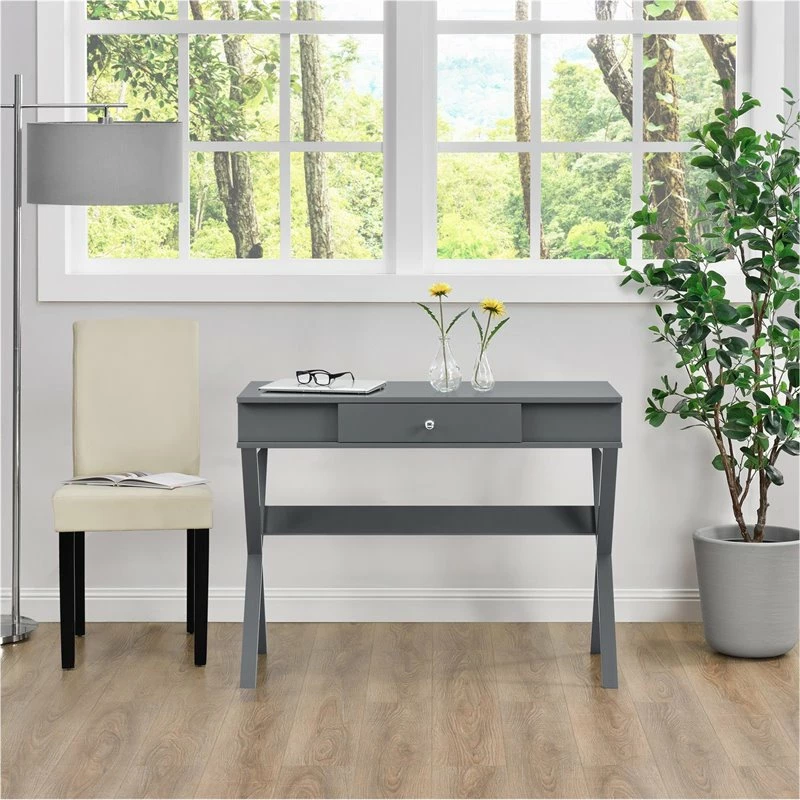 - Painted black finish looks great on the strong MDF build of this desk with the silver knob