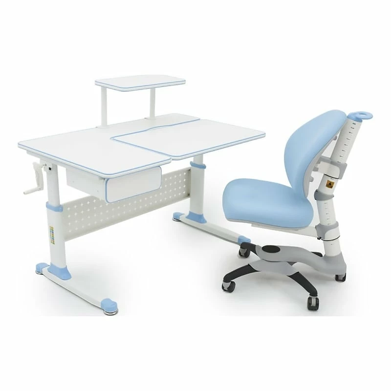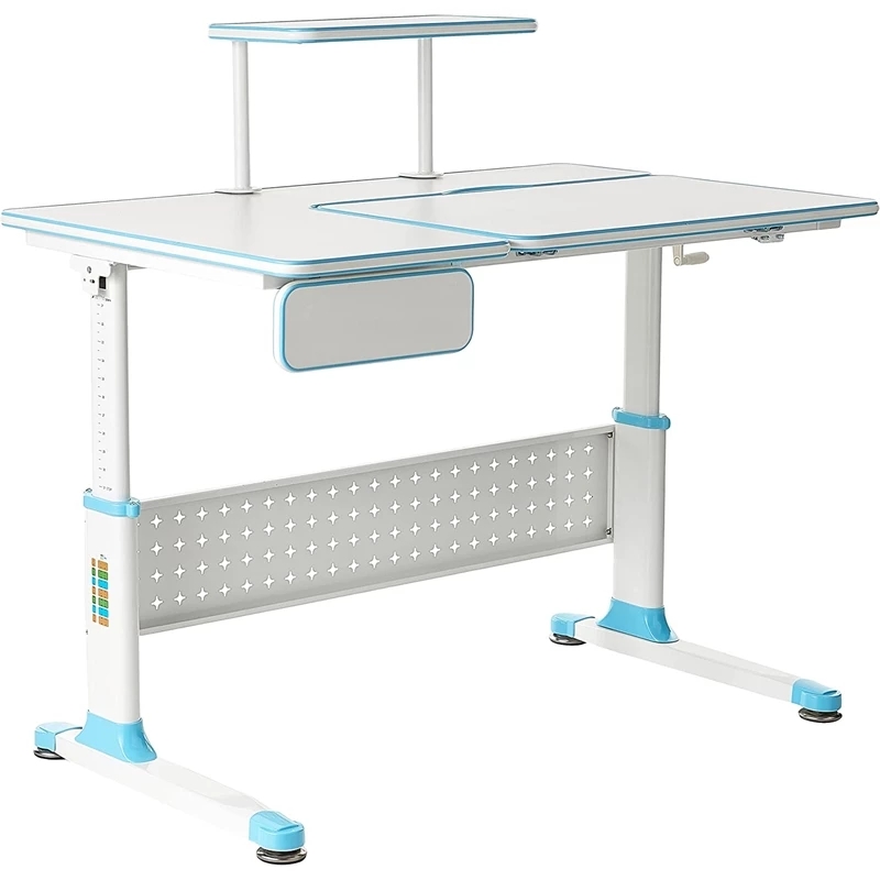 The ApexDesk DX Series height adjustable kid’s desk and chair are a perfect match for growing kids. The desk comes with a drawer, desk shelf, and crossbeam for extra stability. Desk height can be adjusted from 21 to 31 inches high with an easy-to-use manual crank. The entire top measures 43 x 27-in and consists of one L-shaped larger top and one tiltable top that measures 28″ x 18″. It also comes with a 9.5″ x 9″ drawer and a 18.5″ x 10″ bookshelf. The 28″ x 18″ top can be tilted up to 75 degrees. The entire tabletop has rounded corners and rubber bumpers on the surface edges to minimize bumps and bruises while in use. The matching children’s chair has multiple adjustment options. Seat height, seat depth, and backrest can be adjusted independently with ease by twisting polypropylene lock knobs. Simply twist open lock knob, slide the seat and backrest along anchoring rods and lock them into desired position. The seat’s height is adjustable from 12″ to 21″ inches and the backrest height is adjustable from 21″ to 32″. The chair also features a five-caster base with locking casters and comfortable seat/ backrest with memory foam core.