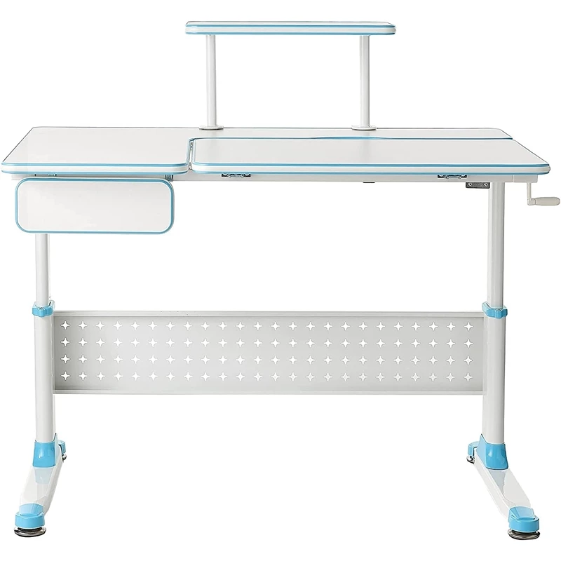 - Desk height adjustable from 21 to 31 inches via manual hand crank. Ample desktop space of 43×27 inches. Split top measures 28×18″ and tilts up to 75 degrees via the built-in pneumatic spring arm. Drawer size 9.5×9″, desk shelf size 18.5×10″.
