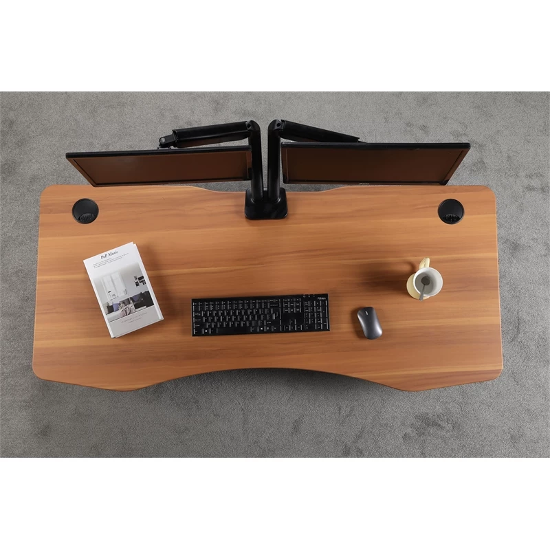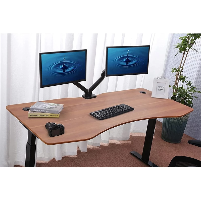 - The ergonomically-shaped top measures 60″W and 27″D (23″ at mid-section). The top is made of laminated MDF. Desk edges are beveled except 10.5″ of mid-section on the back so devices with shorter C-Clamp can be mounted.