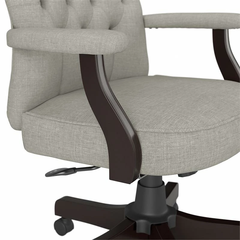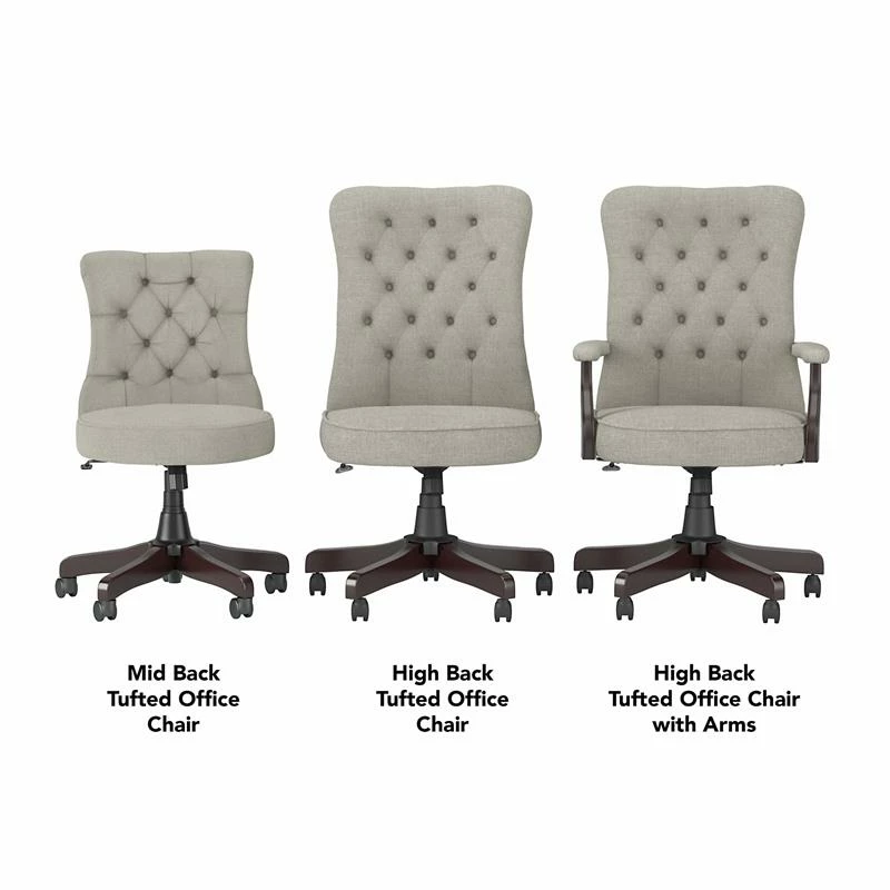 With a stylish design and plenty of colors to choose from, the Bush Business Furniture Arden Lane High Back Tufted Office Chair with Arms offers a sophisticated seating solution for those with fashionable tastes. Along with its appealing look, this desk chair also includes a variety of features intended to provide exceptional comfort and functionality. The tilt mechanism can be set to a custom rate and ease of recline by turning the tension knob located underneath the seat. A convenient lever adjusts the seat height to meet individual preference and is also used to lock the tilt function in an upright position. Made with heavy duty steel and finished with an Espresso Wood cover, the durable base supports the chair for a weight capacity of 275 pounds. This casual swivel chair is tested to meet ANSI/BIFMA quality standards for safety and performance and is backed by a 5 Year Warranty.