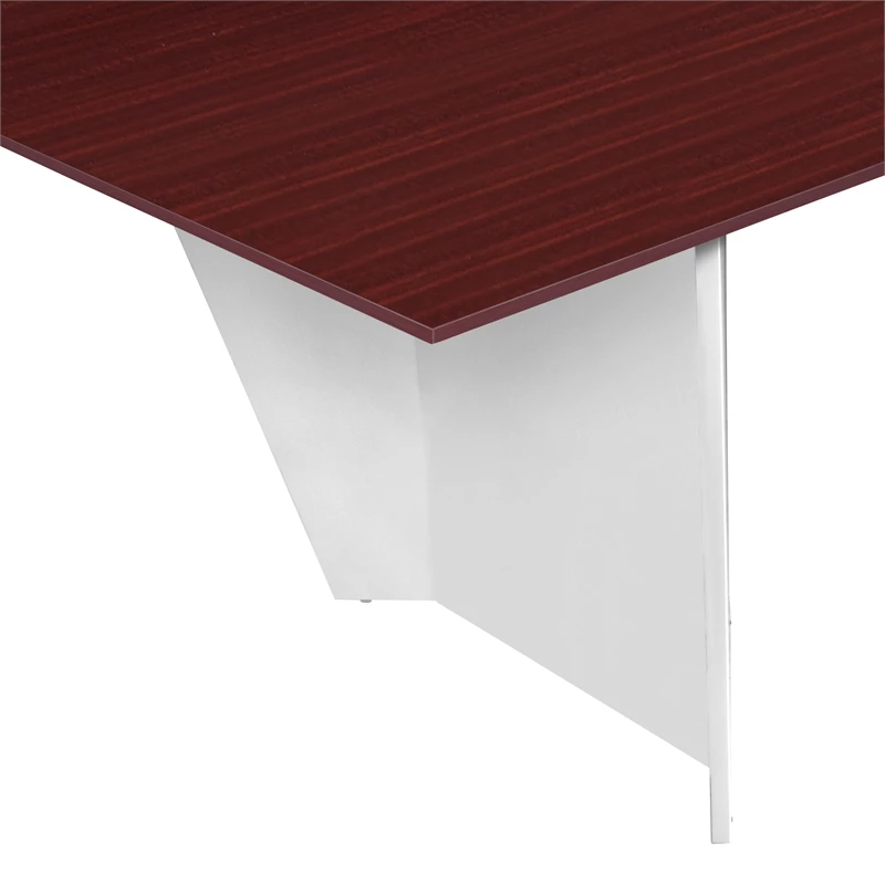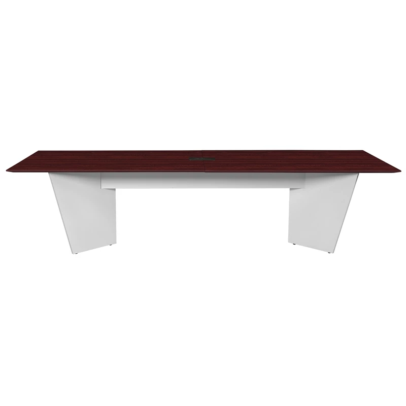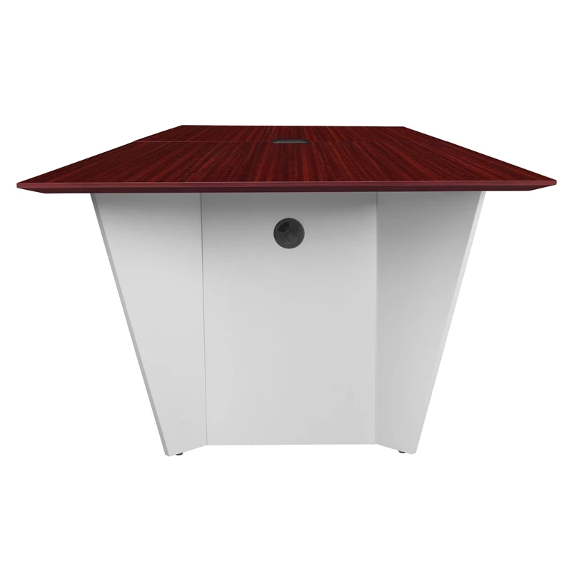 Let the sleek new Array conference tables point your meetings in the right direction. The modern tapered base design allows for more leg room and includes a hidden trough underneath the table and cutouts on the interior of the legs to keep power cables completely out of view. Integrated tabletop power makes connectivity a breeze. The power station lays flat with the table surface when not in use and a spring loaded hinge allows the entire face to angle upwards with one touch to access connections. The front of the unit includes (2) three-prong outlets with a 125V 12A rating, (2) USB charging ports, (1) Ethernet port, (1) VGA connection and (1) HDMI coupler. The rear of the unit has both an outgoing VGA and HDMI port and an outgoing Ethernet port. No extra hardware is required- simply plug in the included 10-foot cord into a standard three-prong wall outlet. The tabletop is constructed of an Mahogany thermal fused melamine laminate that is scratch, stain and scald resistant. The all-new chamfered edges give Array tables the look of a thin, lightweight top without sacrificing the sturdiness and functionality of a thicker tabletop. The base is constructed of the same sturdy material and finished in an attractive white that matches any decor. This 10-foot table seats 8-10 people. Array tables are backed by a 10-year limited manufacturer’s warranty.