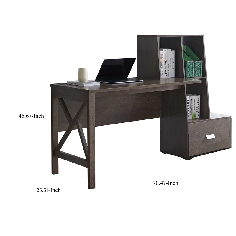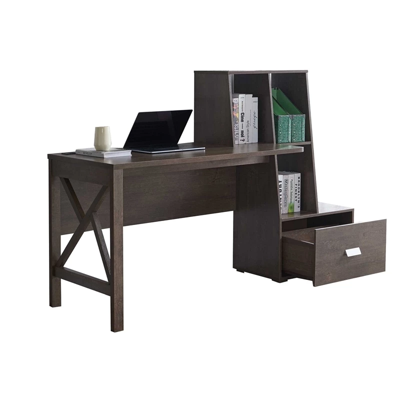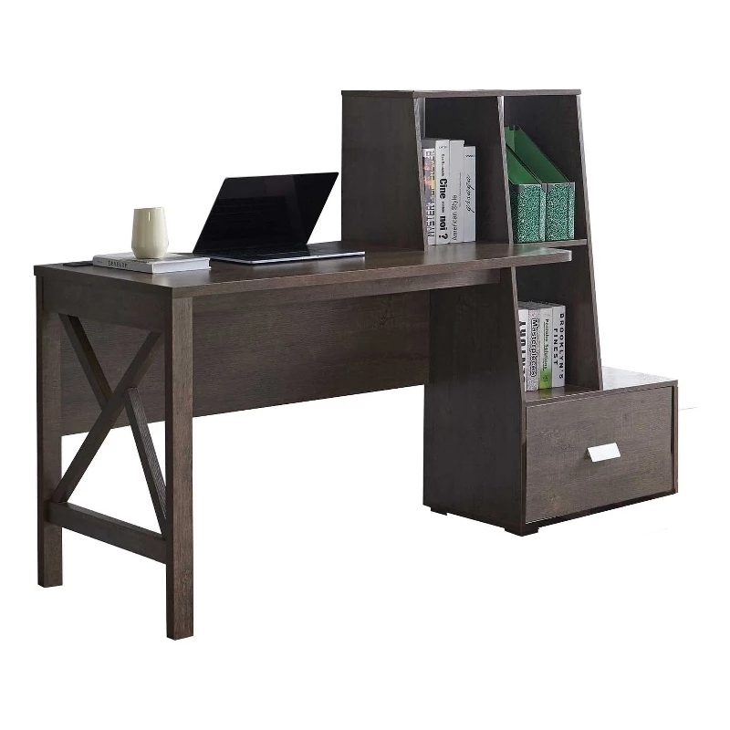 Simple and functional, this walnut brown finished desk is perfect for adding a touch of class and elegance to your workspace. It offers convenient space with firm, rectangular top, one drawer, and three open compartments for storing away important documents. The sturdy wood and composite frame ensure the stability and durability of the desk.