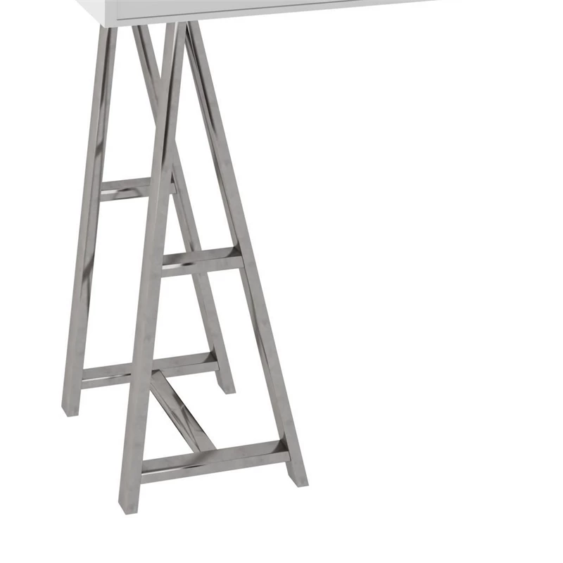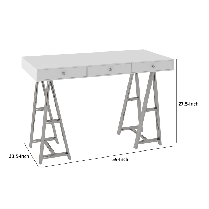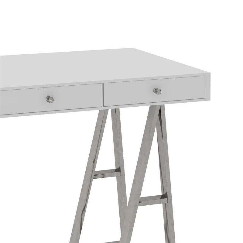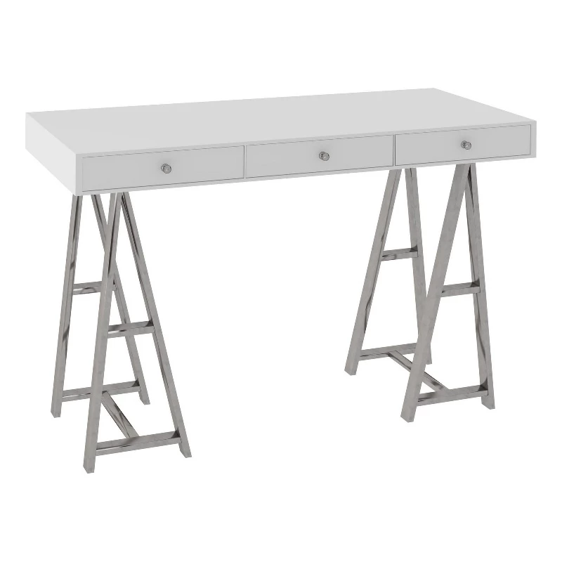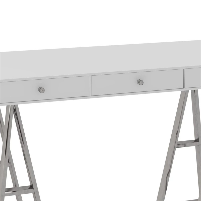 This elegant modern office desk or console table is perfect for your home office, living room, foyer. It has three drawers with round metal handles that provide space for your electronics. With a sturdy composite wood frame and durable stainless steel trestle legs, its glossy finish and style bring subtle luxury to your home with ease. Check out our Cid collection for more options.