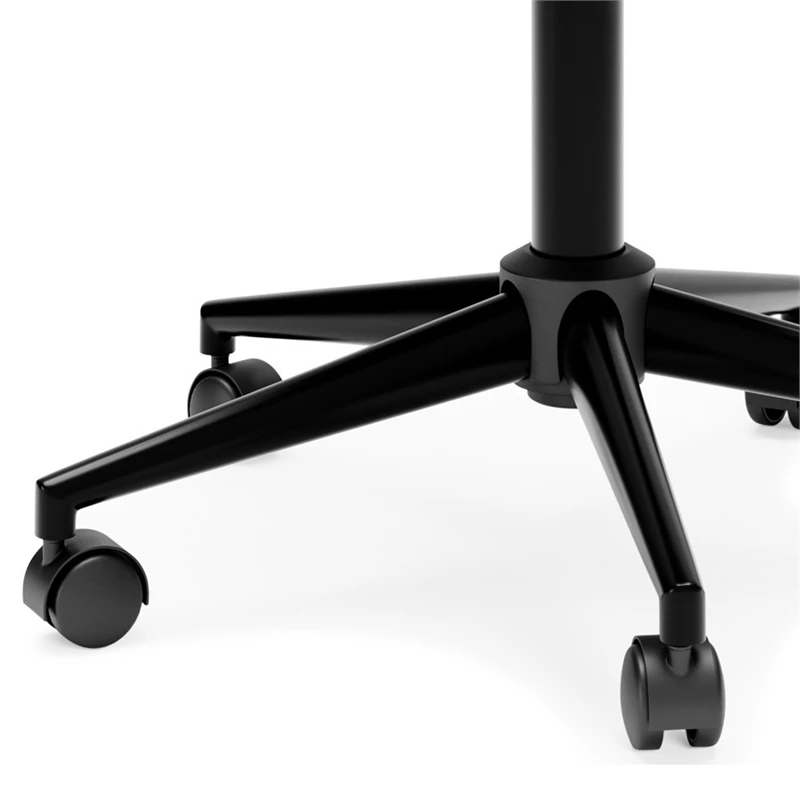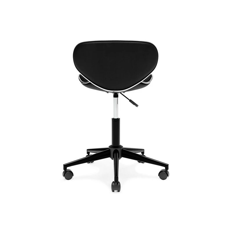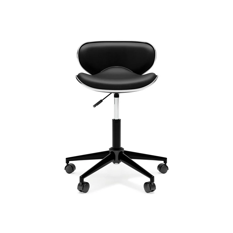 A clean contoured shape and fine craftsmanship embellish this gorgeous home office chair with a sense of timeless elegance. Upholstered in soft black vegan faux leather and completed with a chrome finished metallic frame with adjustable height over five sturdy caster wheels, this chair provides exquisite stability and subtle support for years to come. Check out our Sia collection for more.