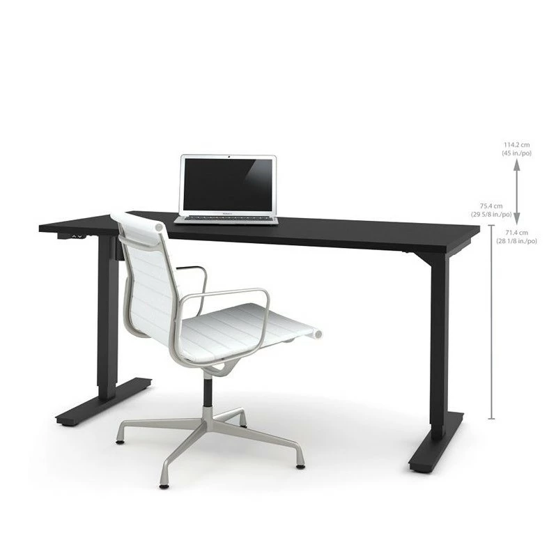 The electric mechanism allows you to quickly and quietly adjust the height of the table from 28″ to 45″. Durable 1″ commercial grade work surface (30” x 60”) with melamine finish that resists scratches, stains and burns. The mechanism meets or exceeds ANSI/BIFMA performance standards. The control button is located on the front edge of the work surface for an easy access. Voltage : 110V. The top surface is available in 7 finishes : Black, White, Northern Maple, Bordeaux, Antigua, Chocolate and Tuxedo.