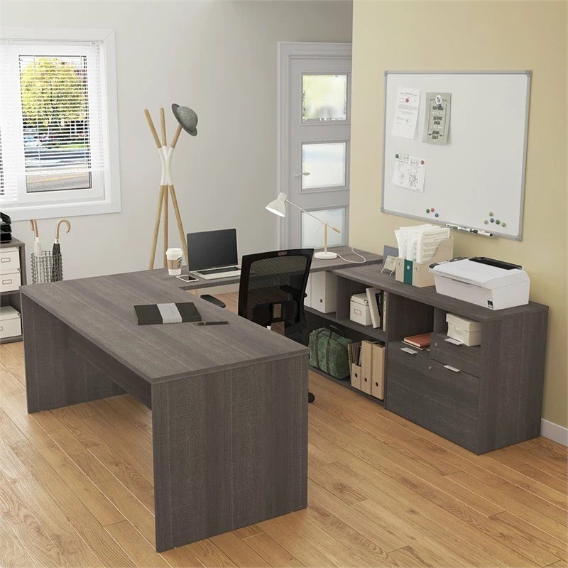 - One utility drawer, one file drawer with letter, legal filing system and five open storage compartments