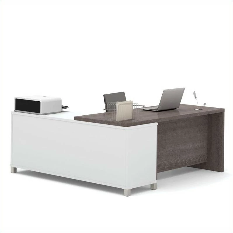 The work surfaces are made of a durable 1.5″ commercial grade work surface with melamine finish that resists scratches, stains and wears. The Credenza is made of a durable 1″ commercial grade work surface with melamine finish. The Return table features a deluxe impact resistant PVC edge. The credenza features three shelves, two of which are adjustable for additional flexibility. Square metal legs with silver finish. The Legs feature levelers to adapt to any floor irregularities. The workstation is fully reversible. The Return table meets or exceeds ANSI/BIFMA performance standards.