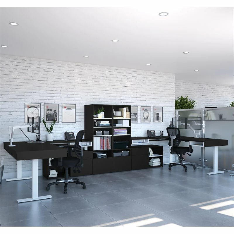 Create two workspaces with this modern desk set. The L-Shaped Standing Desks each offer two open compartments to keep small office supplies within reach. With two fixed shelves and three adjustable shelves each, the Shelving Units accommodate items of various sizes and conceal office clutter in their closed compartments. The Credenzas each feature a box drawer for accessories, a file drawer for documents, and one open compartment with an adjustable shelf for books and more. Free up the work surfaces thanks to the Dual Monitor Arms. This bundle is backed by the Bestar 10 Year Manufacturer’s Warranty, the electric mechanisms are warranted for 2 years, and the dual monitor arms for 1 year. North American made with local and imported parts.
