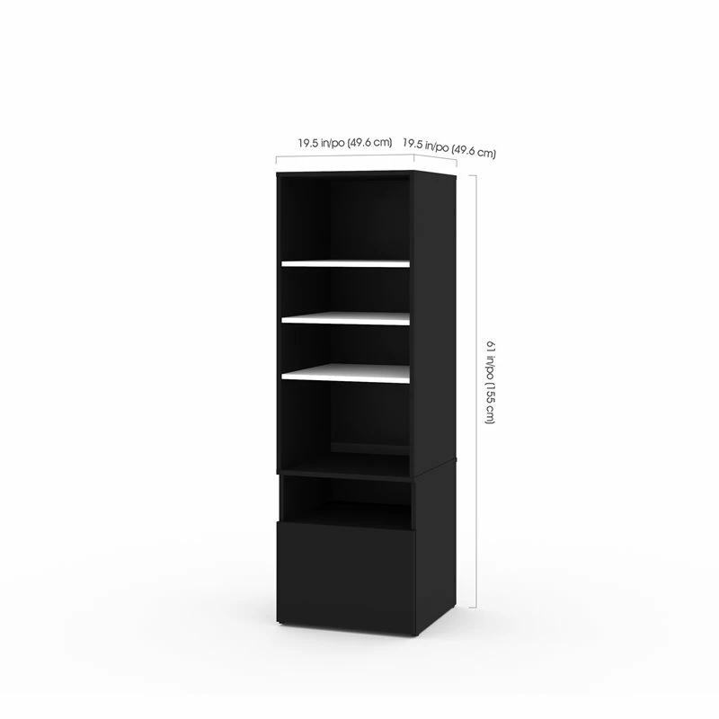 - Shelving units each feature 2 fixed and 3 adjustable shelves for versatile organization and a closed storage area to store objects