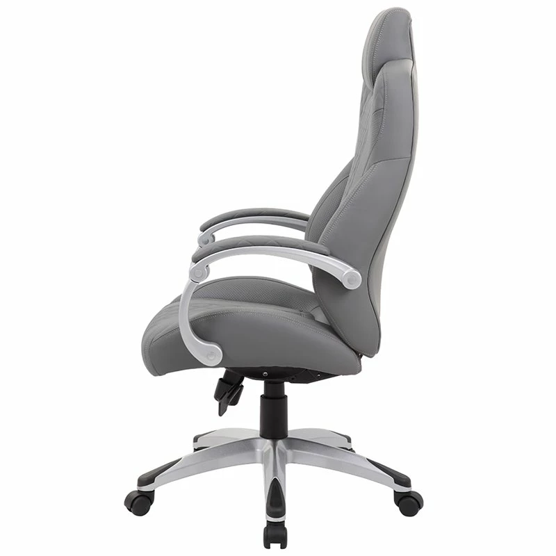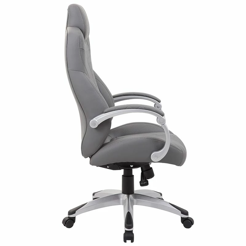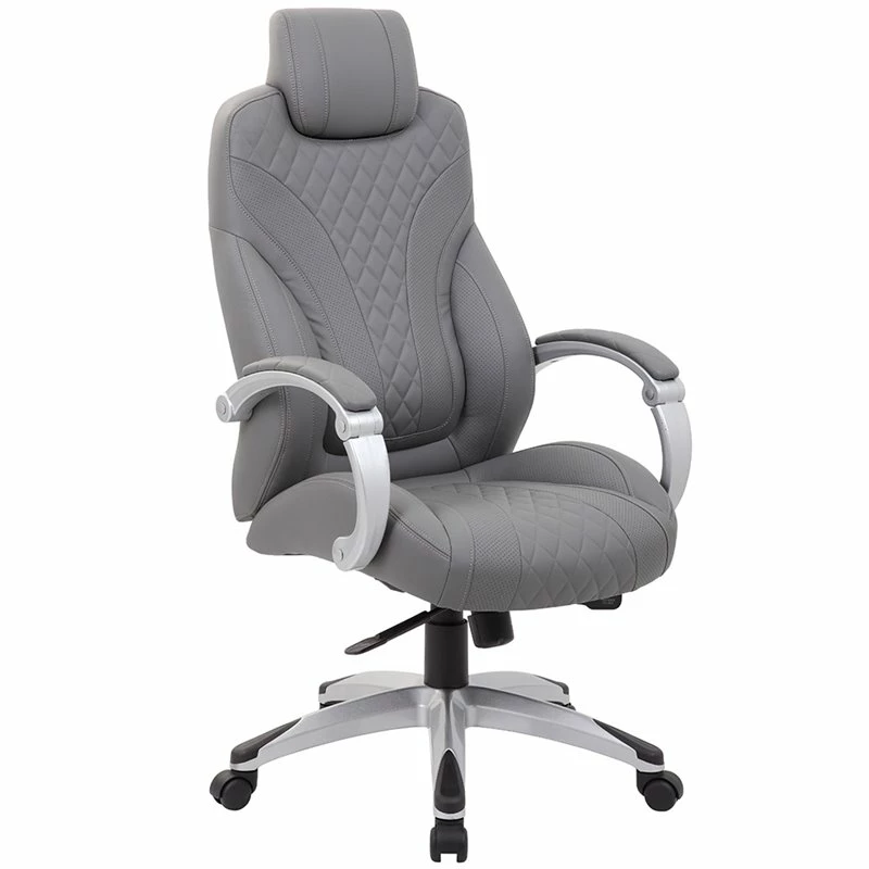 The Boss Office executive hinged arm chair is the perfect addition to your office with its sleek urban appeal coupled with ergonomic function for the utmost support and comfort. Upholstered in cool gray care soft plus with attractive diamond tufting is also easy to clean with a damp cloth. The 2 – 1 seat synchro-tilt allows the seat to lock in any position throughout the tilt range and you choose the perfect height using the pneumatic gas lift seat height adjustment. Featuring hinged arms with padded arm rests and a large 27″ nylon base with hooded double wheel casters for ease of movement and stability. Function meets style with the Boss executive hinged arm chair.