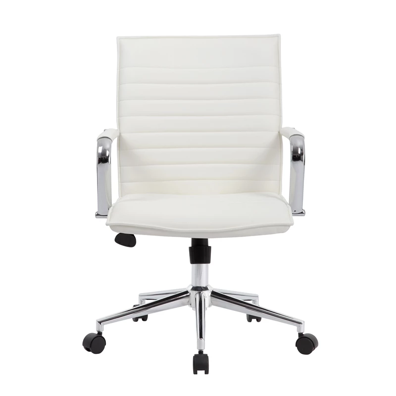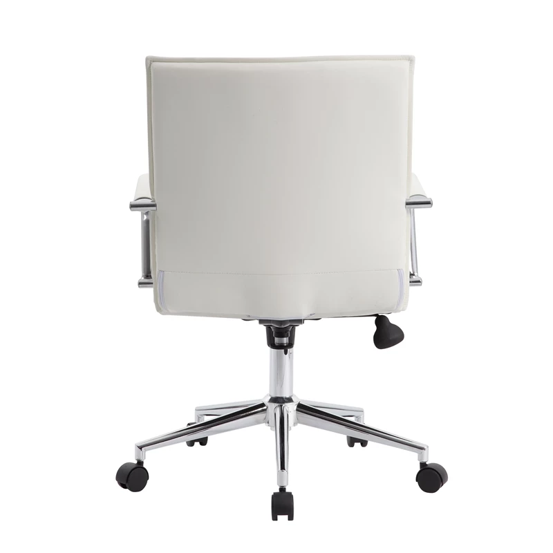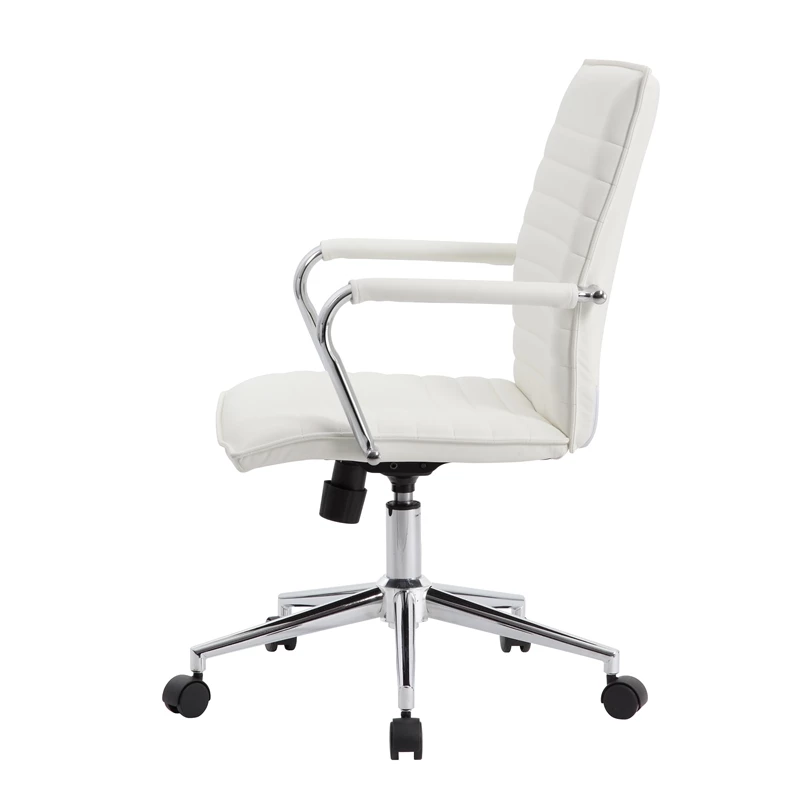 This hospitality task chair in vinyl is designed with fixed chrome arms for that pop of metallic color that brings any room or office to the next level. The chair also features a gorgeous and strong chrome 25 inch base with 2 inch nylon dual wheel castors. In addition to looking fantastic, the chair also features a spring tilt mechanism, a pneumatic gas lift for easy height adjustability, tilt tension and an upright lock, while also boasting a weight capacity of 275 lbs.