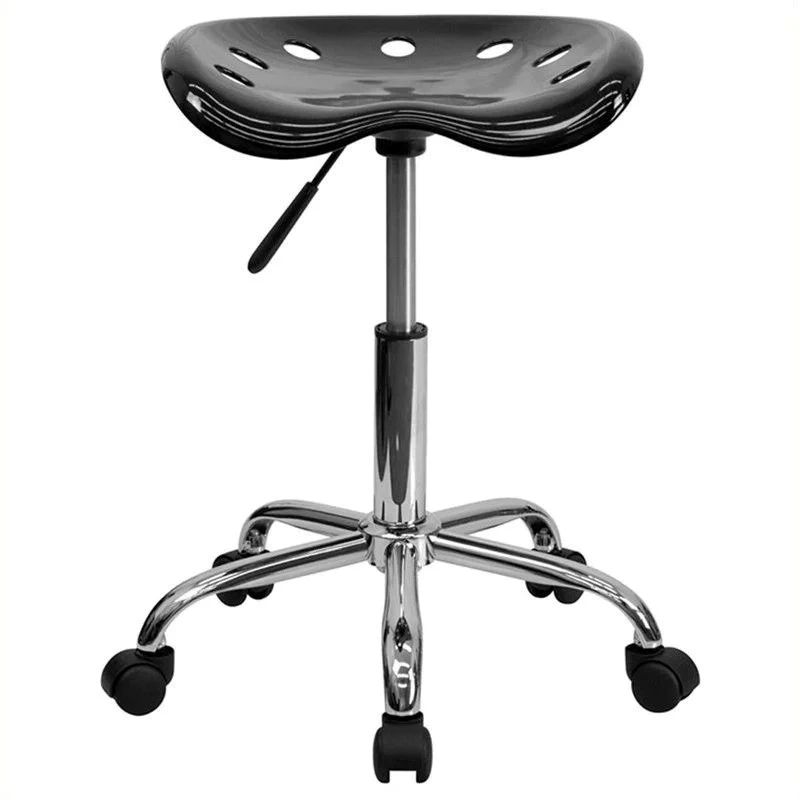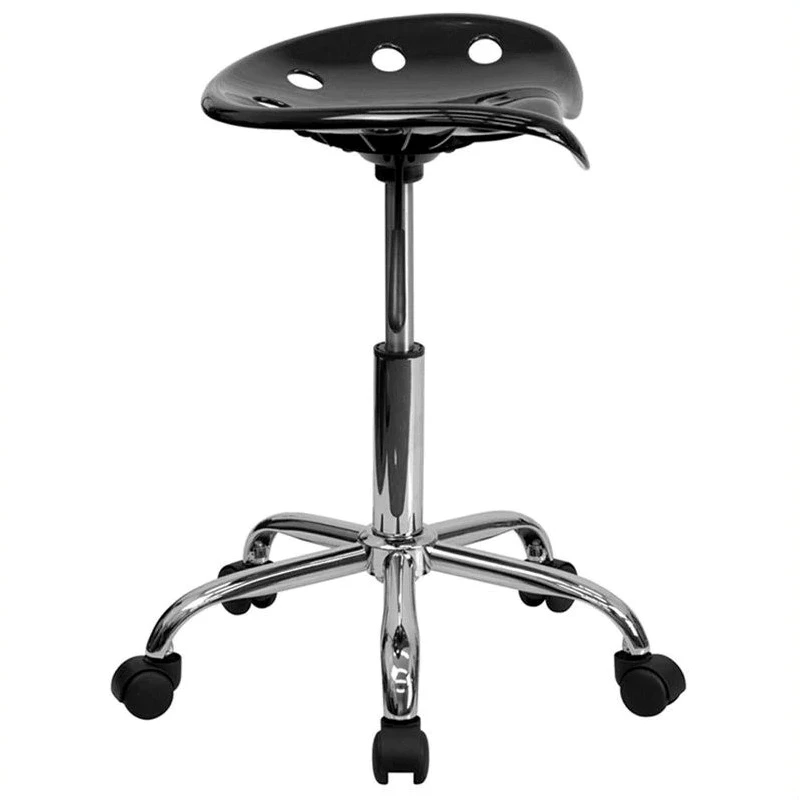 This colorful black modern designed stool is sure to stand out. Backless stools force your core muscles to work by sitting up straight and keeping your feet flat on the floor. The molded tractor seat offers a tremendous amount of comfort and can be cleaned with a solvent and water based cleaner such as foam. Chair rotates 360 degrees to provide easy access to a greater range of area. The pneumatic adjustment lever will allow you to easily adjust the seat to your desired height. Overall the small frame design of this backless stool will make it easy to maneuver around tight spaces with ease.
