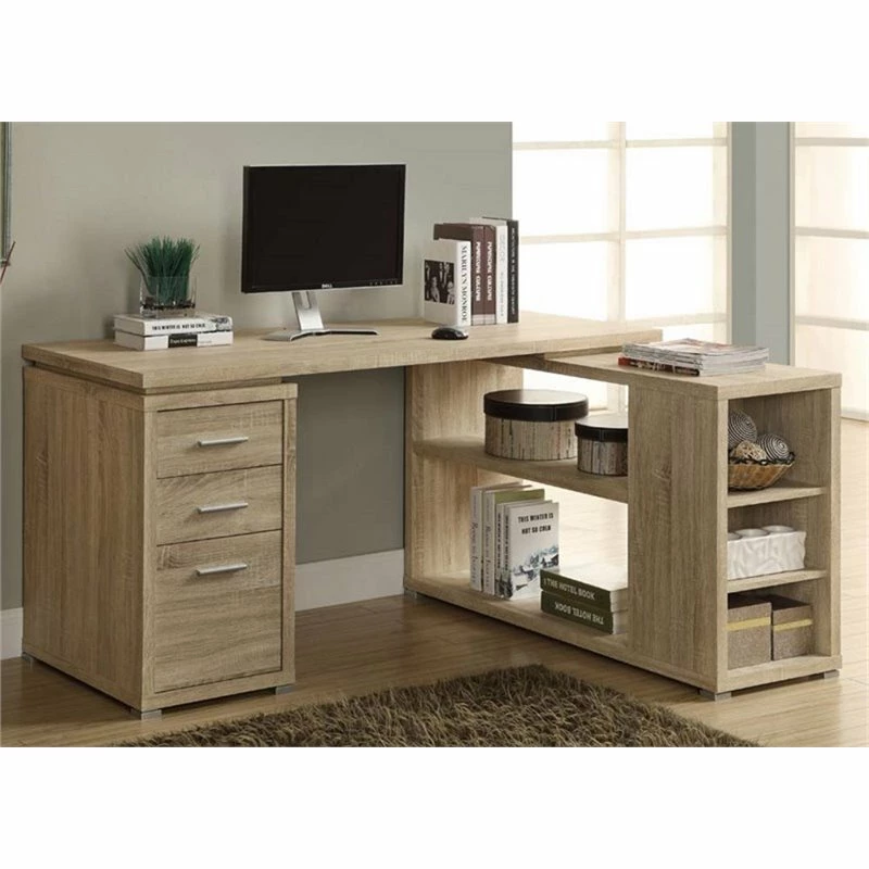 This “L” shaped computer desk will be a stunning focal point in your contemporary home office. This simple and stylish piece features clean sharp lines, in a natural reclaimed wood-look finish. The writing desk offers a spacious work surface that is great for doing paperwork, or using a computer. The secondary surface offers an additional work space, and extra shelves that can be used for a printer or other important items. This piece also features two medium storage drawers and a convenient lateral file drawer below. Its silver colored handles and feet boldly accent the piece making it a must-have for any home.