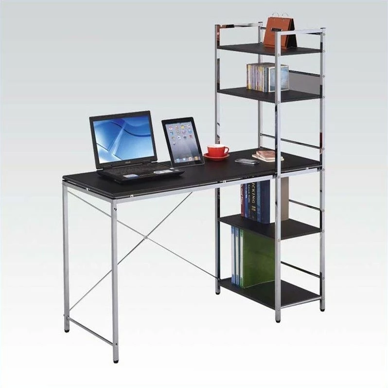 An open designed, contemporary styled computer desk that provides a strong array of customization. Attached to the side is a 5-level tall shelving unit.
