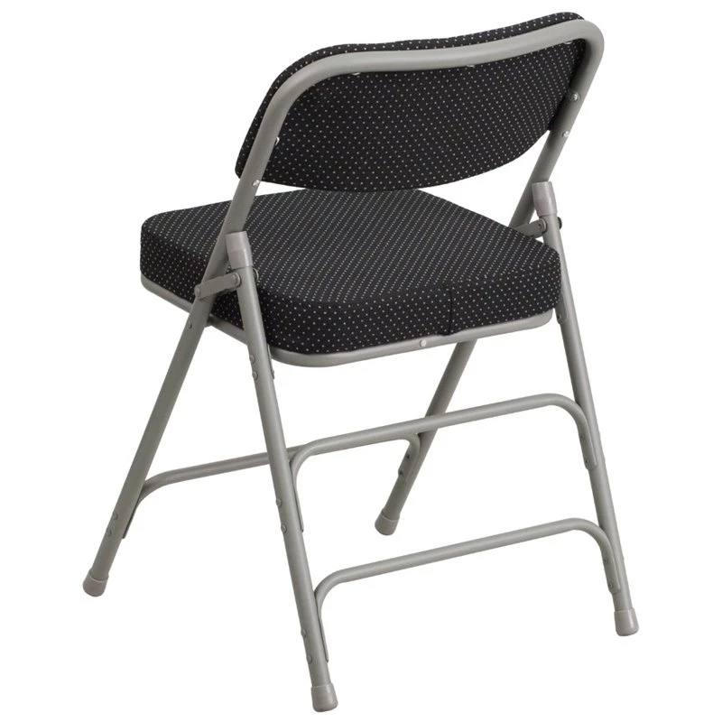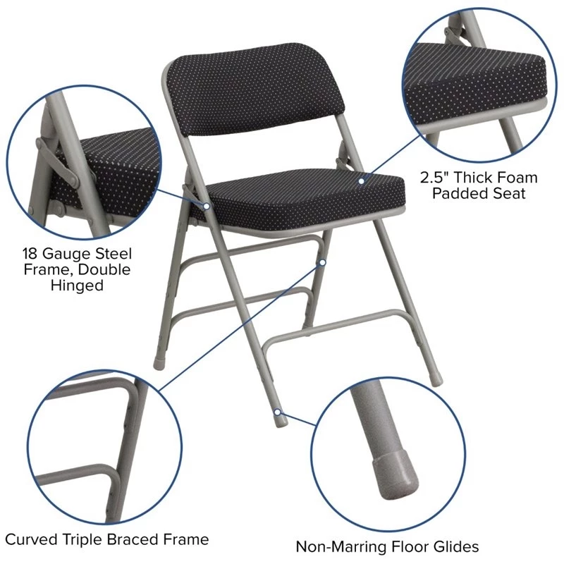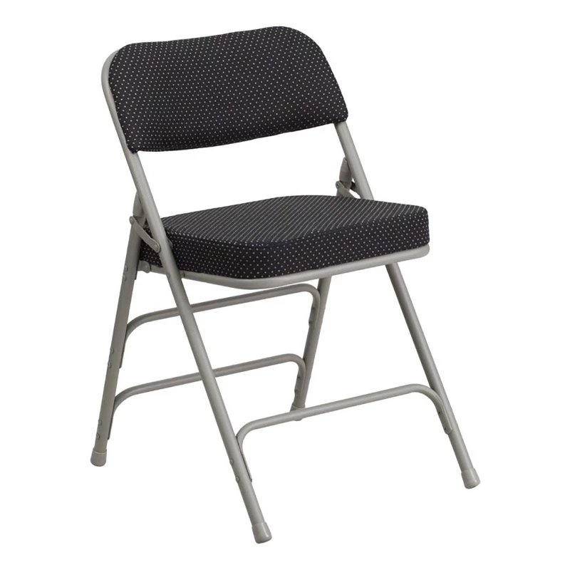 Guests will be amazed in the comfort of this ultra-padded upholstered metal folding chair. Whether you have planned for your guest’s arrival or had a sudden influx of family show up on your doorsteps you’ll be well prepared with these padded folding chairs. Suitable for everyday use you can host holiday parties, birthdays, girl’s night in and game night with chairs that setup quickly and store compactly. Enjoy the good weather by going outdoors to dine and play games. Padded folding chairs provide comfort during extended meetings and social gatherings. Its 18-gauge curved powder coated steel frame is triple braced, and double hinged with leg strengthening support bars to hold up to 300 pounds. Non-marring floor glides on the legs protect your floors by sliding smoothly when you move them. Built for commercial use these attractive chairs are a smart seating solution for your next business meeting as well as in the home for family gatherings and other social events. After outdoor events, store indoors to protect the frames from extreme moisture. With nothing to assemble these chairs come ready to service your needs.