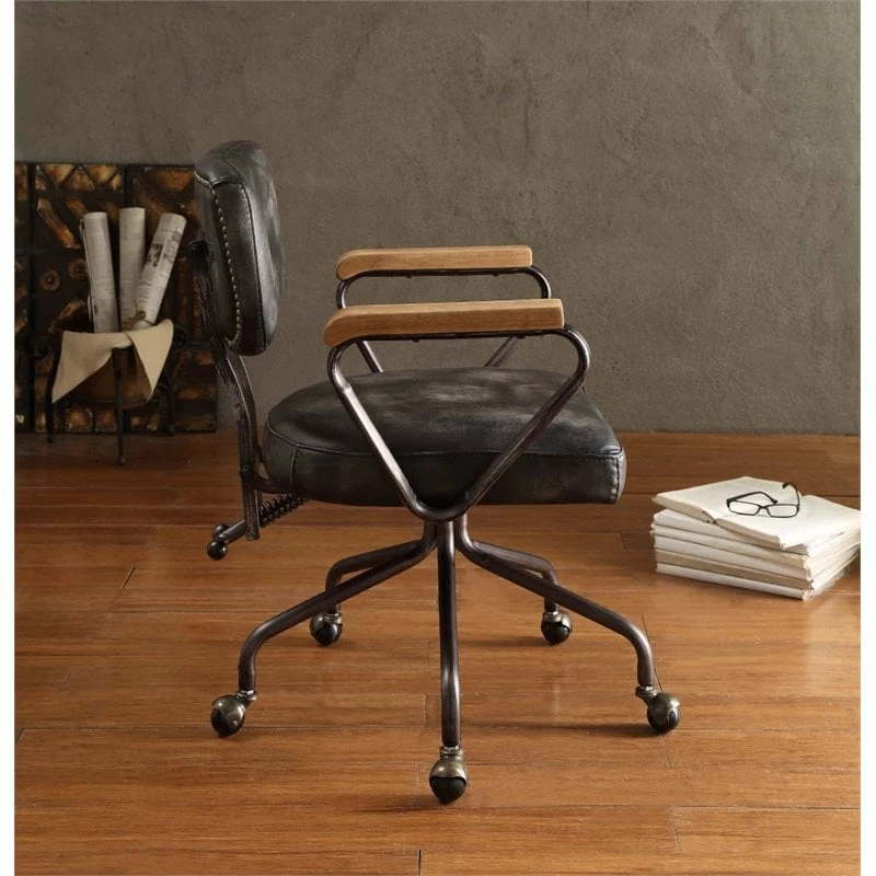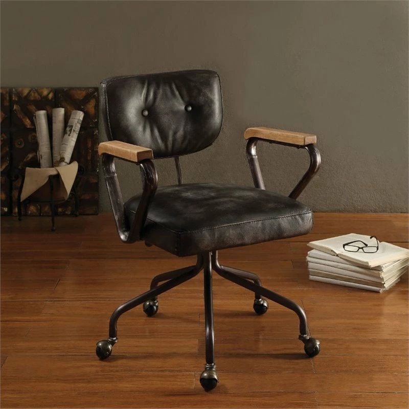 Our durable office chair gets its industrial look from oversized button tufted back and rugged top grain leather. The 5-star swivel base fitted with casters, it keeps you moving from one task to the next. Some assembly required.