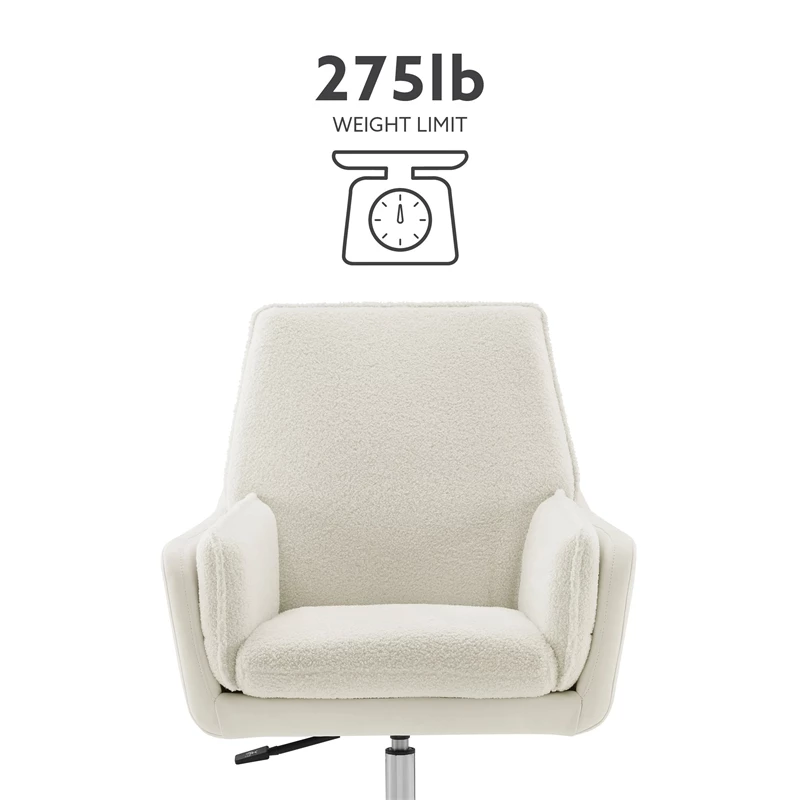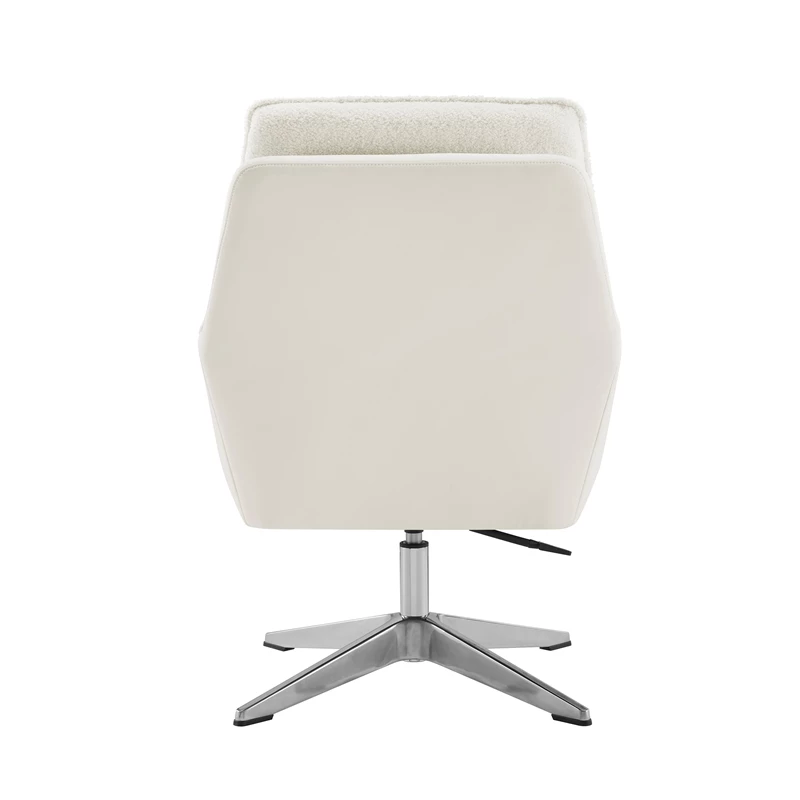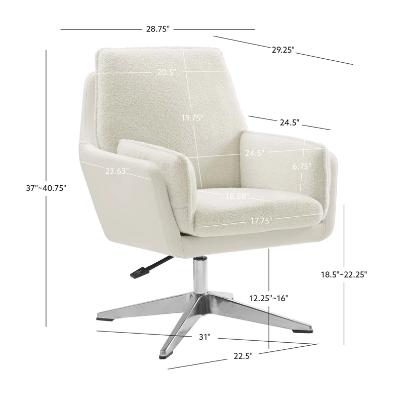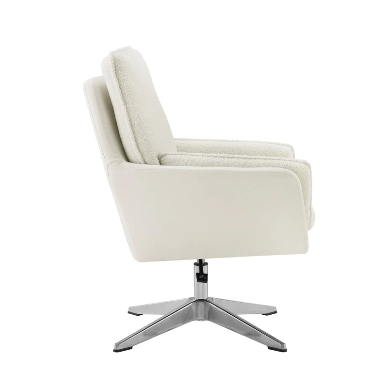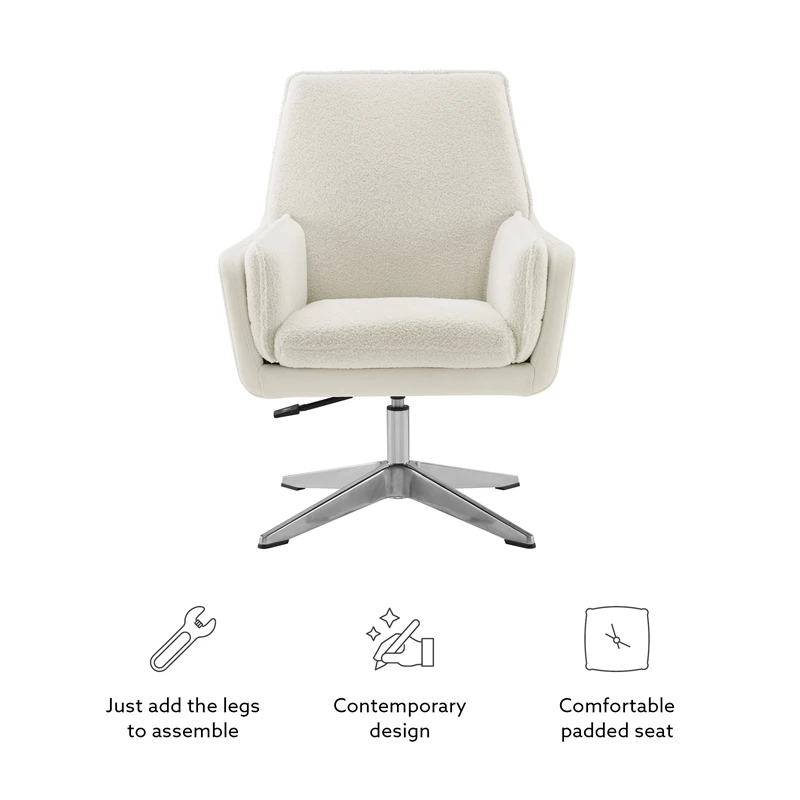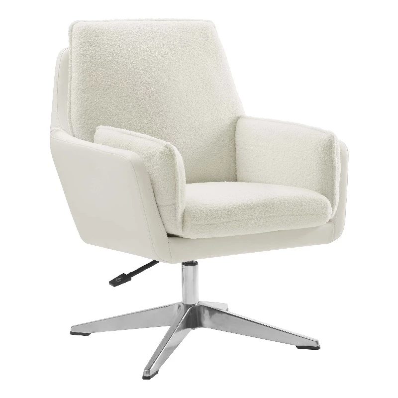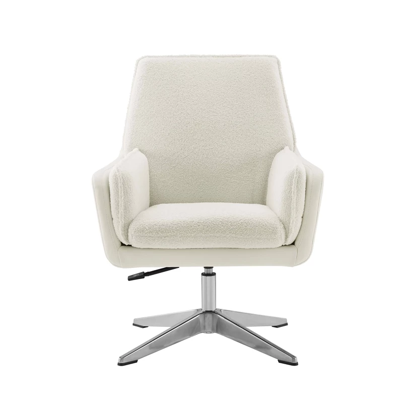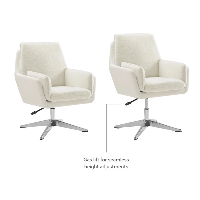 Designed with more than just modern aesthetic in mind, this swivel chair brings comfort and convenience to the forefront. A luxuriously cushioned seat is upholstered in white fabric that’s soft to the touch and framed by a matching white faux leather shell. The chrome base swivels 360 degrees and is outfitted with a gas lift for seamless height adjustments. Whether you’re looking for a contemporary style or a cozy reading perch, this chair will serve as the perfect accent piece in your living room, bedroom, home office and more.