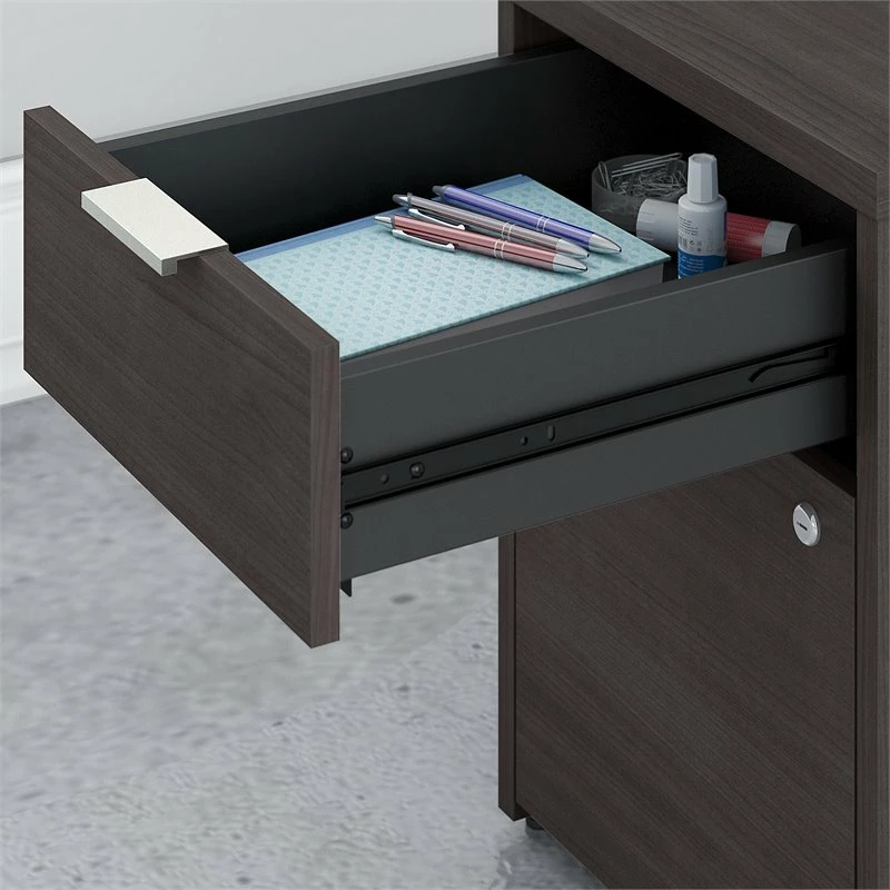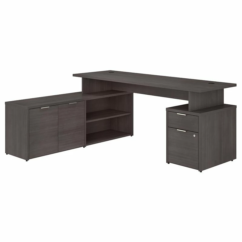 With its contemporary style and an adaptable modular design, the Bush Business Furniture Jamestown 72W L Shaped Desk with Drawers is built to meet the ever-changing demands of today’s workplace. The elevated 72W x 24D surface accommodates multiple monitors and other equipment with a 200 pound weight capacity. One side of the computer desk is supported by a 60W Low Storage Return with open and closed compartments, each of which includes one adjustable shelf for the flexibility to store items of various sizes. On the other side is a 2 Drawer File Cabinet that accepts legal, letter and A4-size paperwork. A single lock secures both of the filing cabinet’s drawers to protect sensitive documents and valuable items. This L Shaped Desk with Storage is tested to meet ANSI/BIFMA standards for safety and performance and is backed by a 10 Year Warranty. American made with U.S. and imported parts.