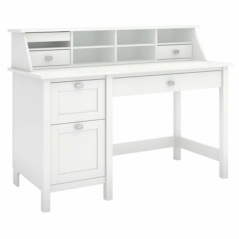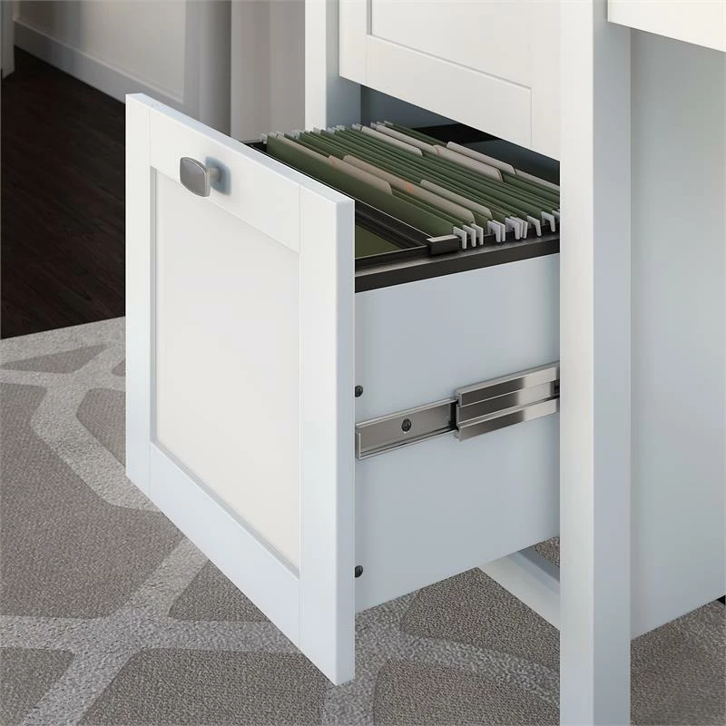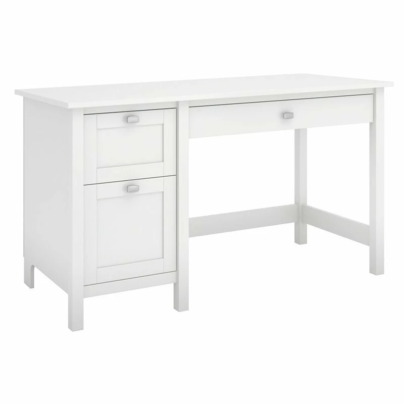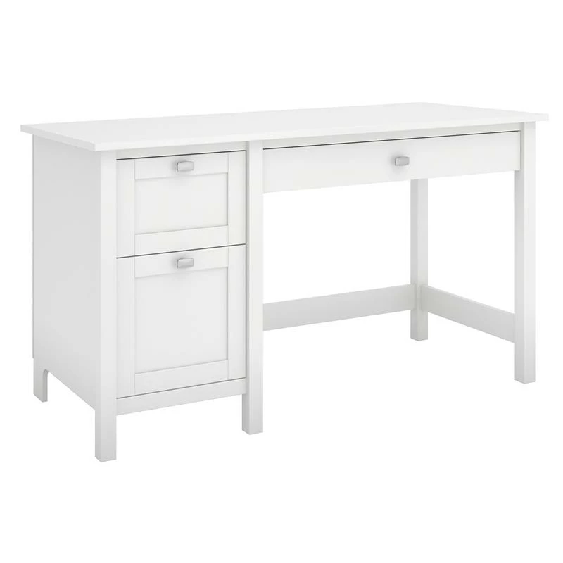 A traditional look with contemporary flair. Bring style into any room with the Bush Furniture Broadview Computer Desk with Drawers. Pull out a large drawer with flip-down front to set up a laptop or keyboard, and spread out with papers or a good book and a cup of coffee on the wide Pure White surface. Stash pens, paper and checkbooks in the box drawer while using the file drawer to clear the Desk from clutter. Fill the drawer with letter-size files and enjoy smooth full-extension ball bearing slides for easy access to the back. Sturdy post leg design provides years of trouble-free use, while the Pure White finish fends off scratches and stains. Satin Chrome hardware completes the contemporary look. You’ll enjoy this improved design with drawer slides and leg components that now come pre-assembled for significantly faster assembly. Backed by a 1-Year Warranty.