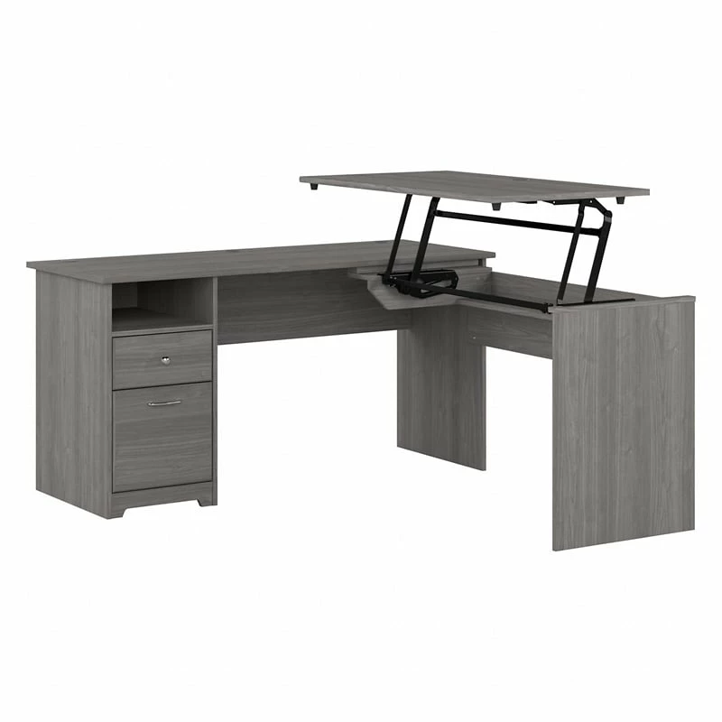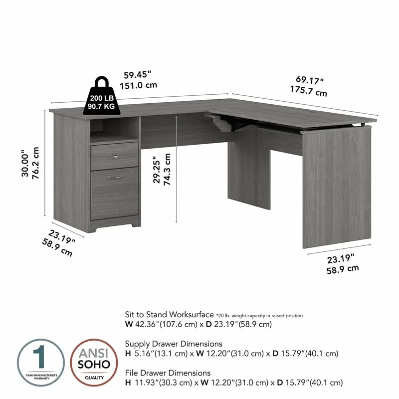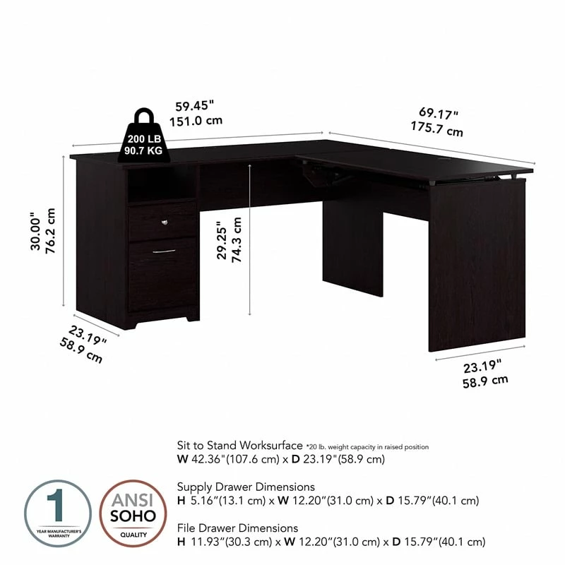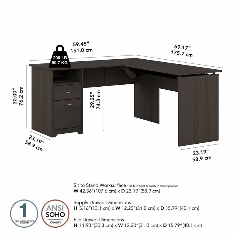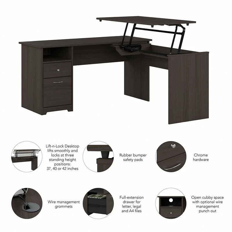 The Bush Furniture Cabot 60W 3 Position Sit to Stand L Shaped Desk presents an ergonomic home office solution with transitional style. Enjoy the freedom to change positions throughout the day with a convenient Lift-n-Lock desktop that adjusts to three standing desk heights: 37, 40, and 42 inches from the floor. The adjustable desk surface supports up to 20 lbs. when extended so you can take materials with you while giving your back and neck a break from sedentary work. The fixed work surface features built-in wire management and has a weight capacity of 200 lbs. to accommodate multiple monitors and equipment. A file drawer, box drawer, and open cubby shelf keep all your documents and supplies organized and accessible. This ergonomic home office desk with storage has been rigorously tested to meet or exceed ANSI/SOHO standards for safety and performance and is backed by a 1 Year Warranty.