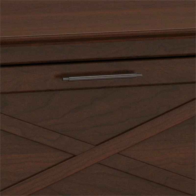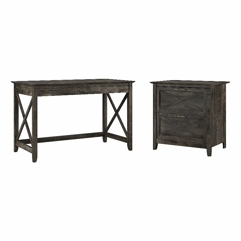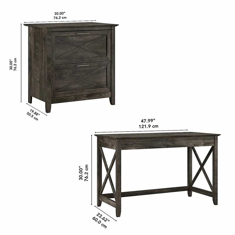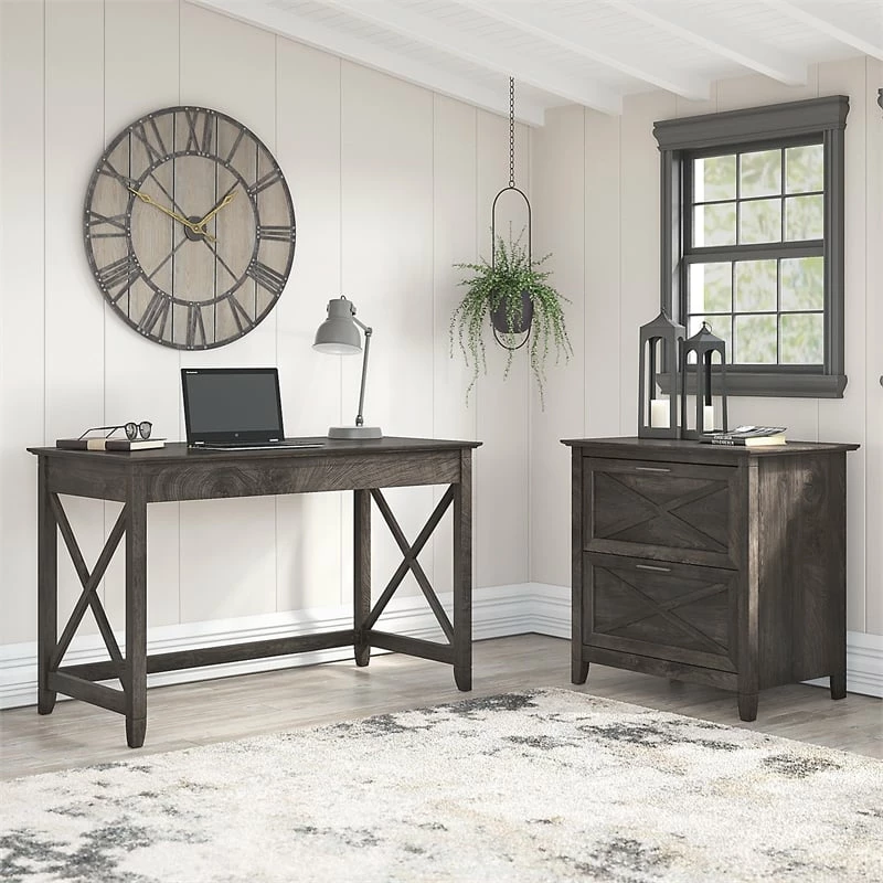 A natural fit for many homes, the Bush Furniture Key West 48W Writing Desk and Lateral File Cabinet create a comfortable and spacious feeling, even in small areas. This Desk has a cottage style motif featuring a unique X accent on the side panels with a reclaimed Washed Gray finish and an attractive post leg design. This accent carries over to the Lateral File Cabinet drawer panels complemented with Aged Bronze handles. Enjoy full extension ball bearing slides on the two file drawers for easy access to your letter or legal size folders. Both the Lateral File Cabinet and Writing Desk are fully finished on the back for placement in a variety of positions and are the same height to create an extended workspace if placed side by side. Meets ANSI/SOHO standards for safety and performance and backed by the Bush Furniture 1 Year Manufacturer’s Warranty.