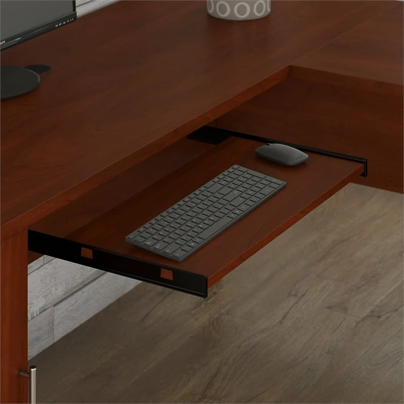 Maximize the potential of your home office with the Bush Furniture Somerset 60W L Shaped Desk with Hutch. Create your remote work headquarters with space for a computer, phone, printer and more. A convenient pull-out shelf provides a perfect place to keep a keyboard or laptop, while a storage cabinet and box drawer offer plenty of storage for supplies. A file drawer with ball bearing slides allows for easy access to letter size documents. Wire management slots help keep cords and cables in order. The Hutch features open storage with a large compartment for books or decorations, an adjustable shelf to hold work-in-progress, and 2 lift-up frosted glass doors that provide concealed storage. This office furniture set is tested to meet ANSI/SOHO standards for safety and performance and is backed by the Bush Furniture 6 Year Manufacturer’s Warranty. American made with U.S. and imported parts.