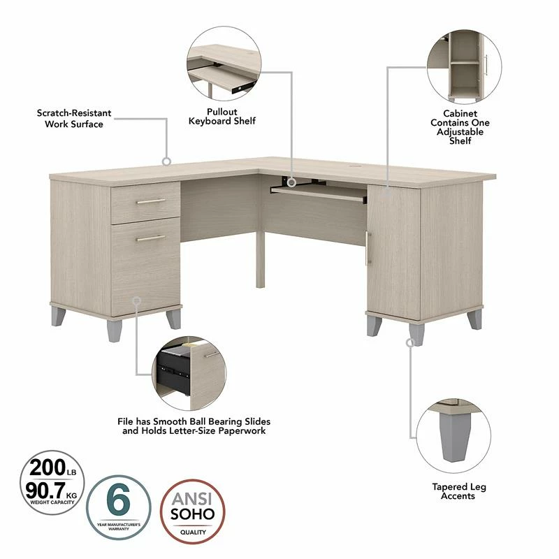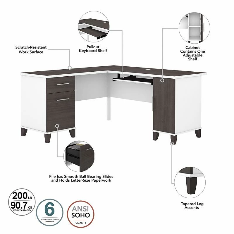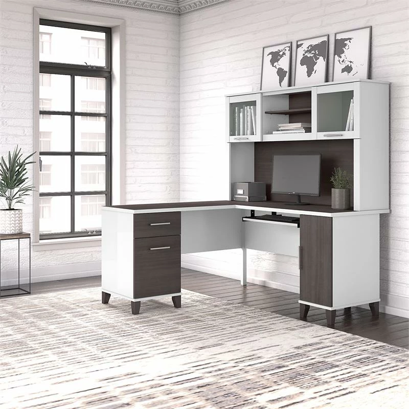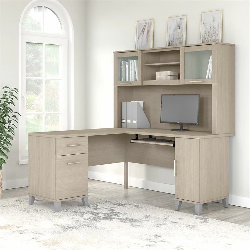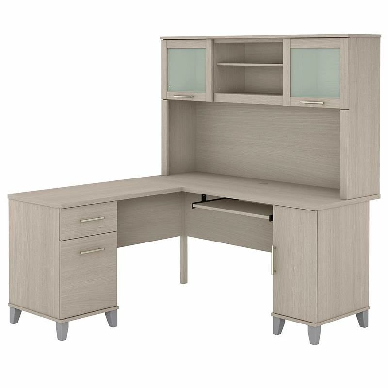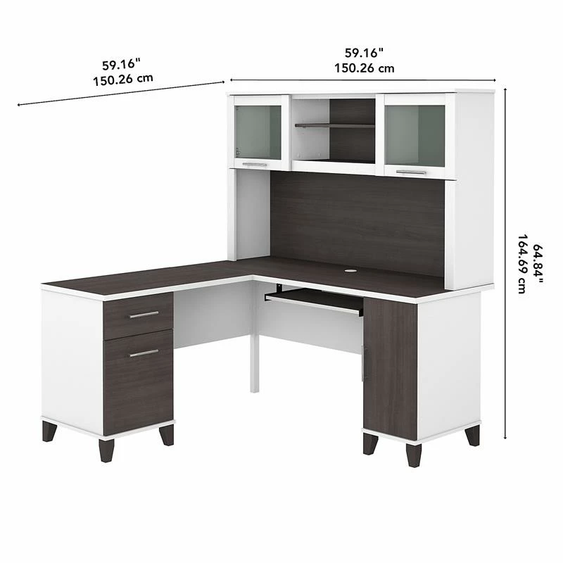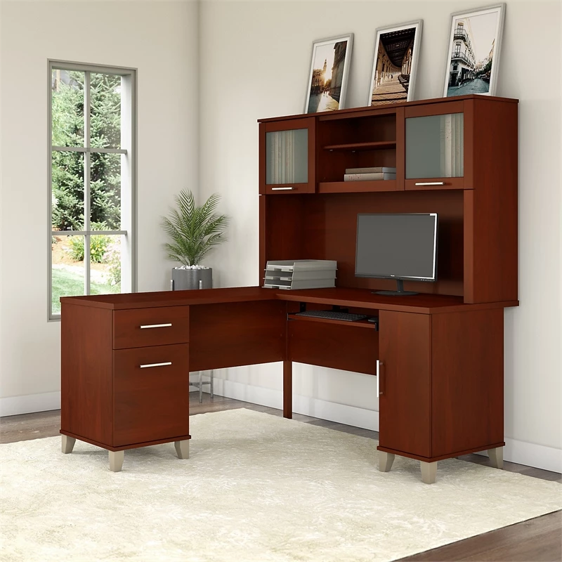 Maximize the potential of your home office with the Bush Furniture Somerset 60W L Shaped Desk with Hutch. Create your remote work headquarters with space for a computer, phone, printer and more. A convenient pull-out shelf provides a perfect place to keep a keyboard or laptop, while a storage cabinet and box drawer offer plenty of storage for supplies. A file drawer with ball bearing slides allows for easy access to letter size documents. Wire management slots help keep cords and cables in order. The Hutch features open storage with a large compartment for books or decorations, an adjustable shelf to hold work-in-progress, and 2 lift-up frosted glass doors that provide concealed storage. This office furniture set is tested to meet ANSI/SOHO standards for safety and performance and is backed by the Bush Furniture 6 Year Manufacturer’s Warranty. American made with U.S. and imported parts.