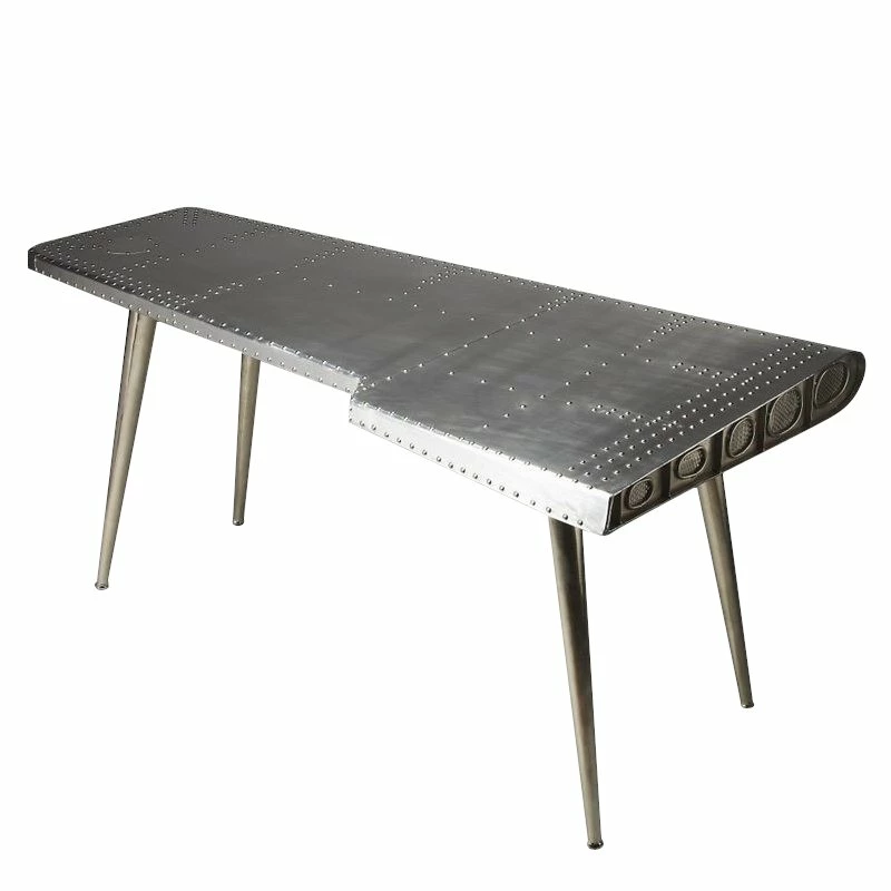 This desk is riveting, soaring with the flair of an airplane wing and guaranteed to help a room take flight. Crafted from polished aluminum and rivets, this shimmering desk sits atop four matching legs that taper down for a very smooth landing indeed.
