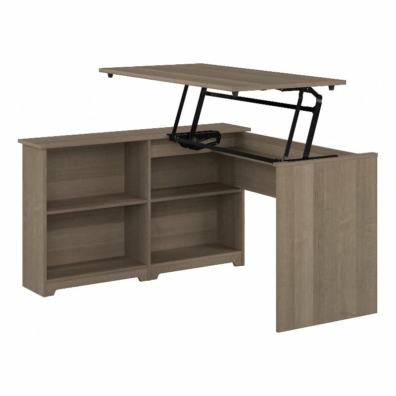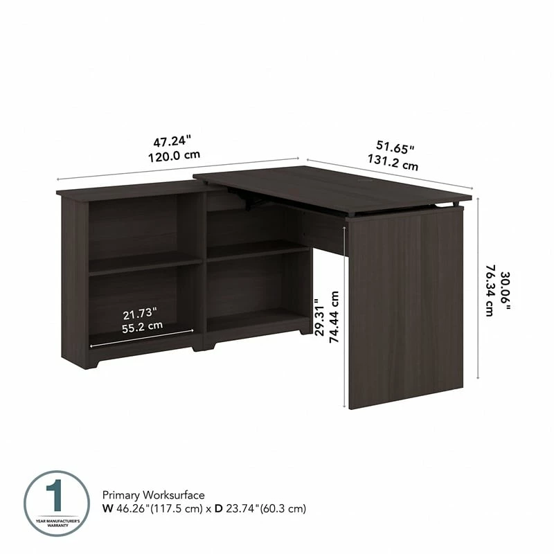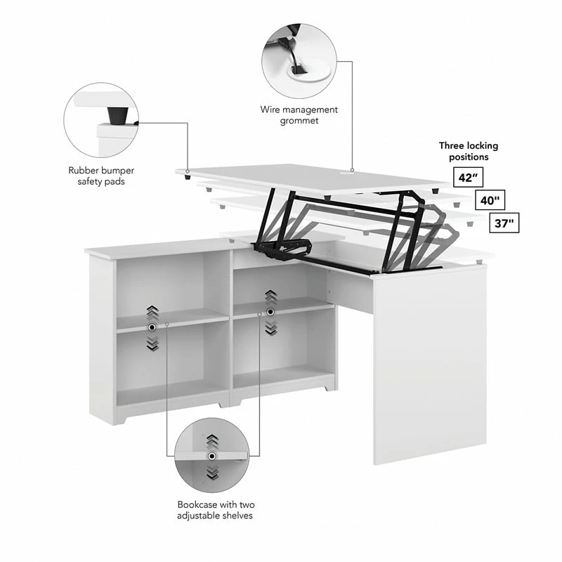 The Bush Furniture Cabot 52W 3 Position Sit to Stand Corner Desk with Shelves presents an ergonomic home office solution with transitional style. Enjoy the freedom to change positions quickly and easily throughout the day with a convenient Lift-n-Lock desktop that adjusts to three standing desk heights: 37, 40, and 42 inches from the floor. The durable surface supports up to 20 pounds when extended so you can take materials with you while giving your back and neck a break from sedentary work. The adjustable desk’s built-in shelves are perfect for organizing books, supplies, and anything else you need to stay on task. Each shelf supports up to 50 pounds, and the center shelves can be adjusted to accommodate items of various sizes. This ergonomic desk with storage has been rigorously tested to meet or exceed industry standards for safety and performance and is backed by a 1 Year Warranty.