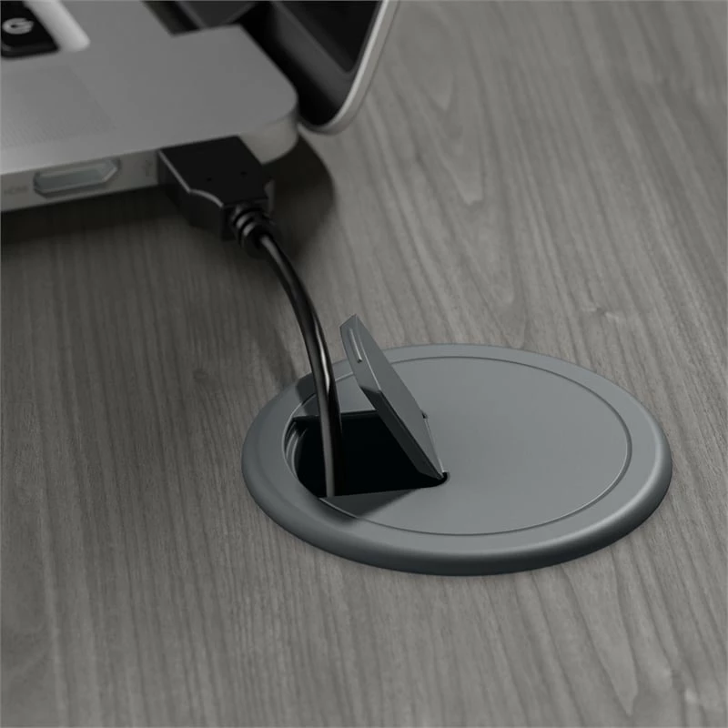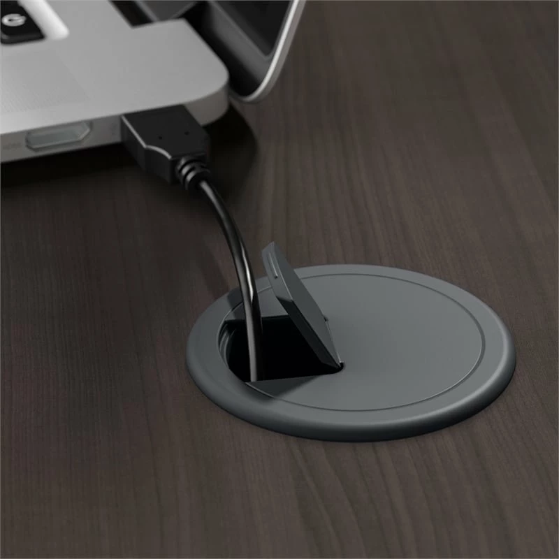 - Monitor arm (not included) can be installed in the bookshelf desk’s wire management grommets