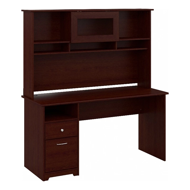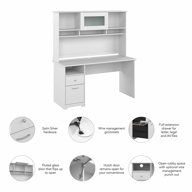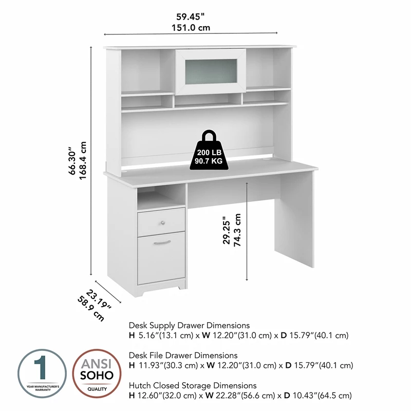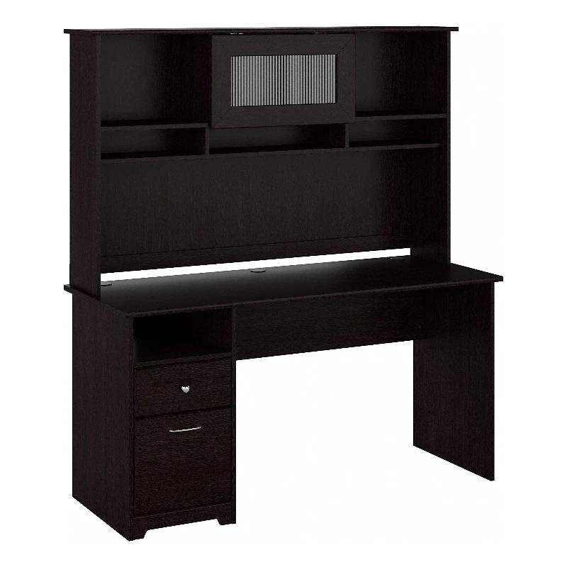 The Bush Furniture Cabot 60W Computer Desk with Hutch presents a home office solution with transitional style. The durable 60-inch desk surface supports up to 200 pounds and has built-in wire management to keep cords and cables out of the way while you work. A single file drawer opens on smooth full-extension ball bearing slides for an effortless reach to letter, legal, and A4-size paperwork while the box drawer organizes small office supplies. The Desk Hutch adds a closed compartment behind a fluted glass door along with right and left shelves for flexible storage and display capacity. Multiple open cubby spaces are perfect for keeping work-in-progress and frequently used materials easily accessible. This home office desk and hutch set has been rigorously tested to meet or exceed ANSI/SOHO quality standards for safety and performance and is backed by a 1 Year Manufacturer’s Warranty.