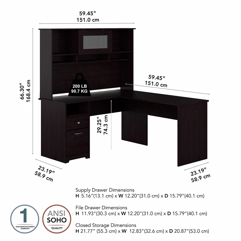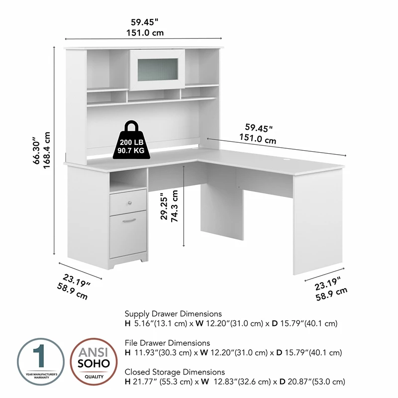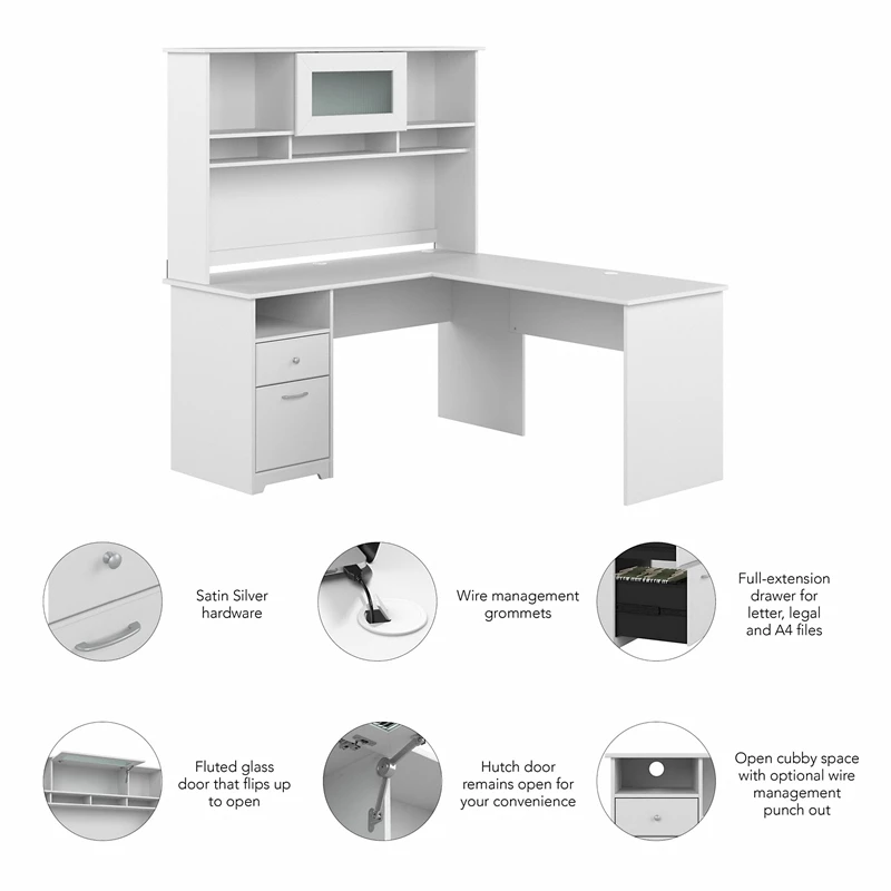 The Bush Furniture Cabot 60W L Shaped Computer Desk with Hutch and Drawers presents a home office solution with transitional style. The durable 60-inch L Shaped Desk surface supports up to 200 pounds and has built-in wire management to keep cords and cables out of the way. A file drawer opens on smooth full-extension ball bearing slides for an effortless reach to letter, legal, and A4-size paperwork while a box drawer organizes small office supplies. The Desk Hutch adds a closed compartment behind a fluted glass door along with right and left shelves for flexible storage and display capacity. Multiple open cubby spaces are perfect for keeping work-in-progress and frequently used materials easily accessible. This corner desk with storage has been rigorously tested to meet or exceed ANSI/SOHO quality standards for safety and performance and is backed by a 1 Year Manufacturer’s Warranty.