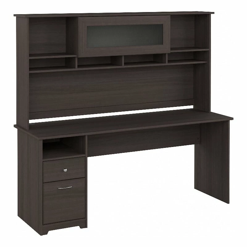 The Bush Furniture Cabot 72W Computer Desk with Hutch presents a home office solution with transitional style. The durable 72-inch desk surface supports up to 200 pounds and has built-in wire management to keep cords and cables out of the way while you work. A single file drawer opens on smooth full-extension ball bearing slides for an effortless reach to letter, legal, and A4-size paperwork while the box drawer organizes small office supplies. The Desk Hutch adds a closed compartment behind a fluted glass door along with right and left shelves for flexible storage and display capacity. Multiple open cubby spaces are perfect for keeping work-in-progress and frequently used materials easily accessible. This home office desk and hutch set has been rigorously tested to meet or exceed ANSI/SOHO quality standards for safety and performance and is backed by a 1 Year Manufacturer’s Warranty.