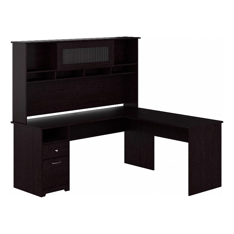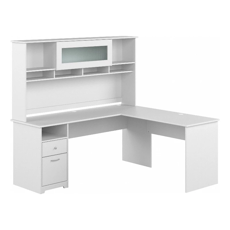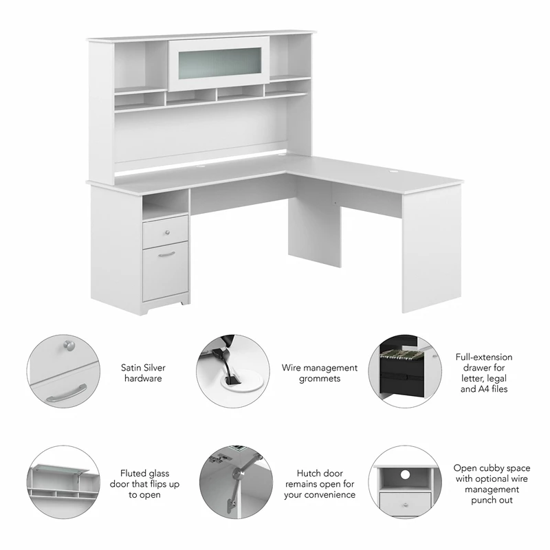 The Bush Furniture Cabot 72W L Shaped Computer Desk with Hutch and Drawers presents a home office solution with transitional style. The durable 72-inch L Shaped Desk surface supports up to 200 pounds and has built-in wire management to keep cords and cables out of the way. A file drawer opens on smooth full-extension ball bearing slides for an effortless reach to letter, legal, and A4-size paperwork while a box drawer organizes small office supplies. The Desk Hutch adds a closed compartment behind a fluted glass door along with right and left shelves for flexible storage and display capacity. Multiple open cubby spaces are perfect for keeping work-in-progress and frequently used materials easily accessible. This corner desk with storage has been rigorously tested to meet or exceed ANSI/SOHO quality standards for safety and performance and is backed by a 1 Year Manufacturer’s Warranty.