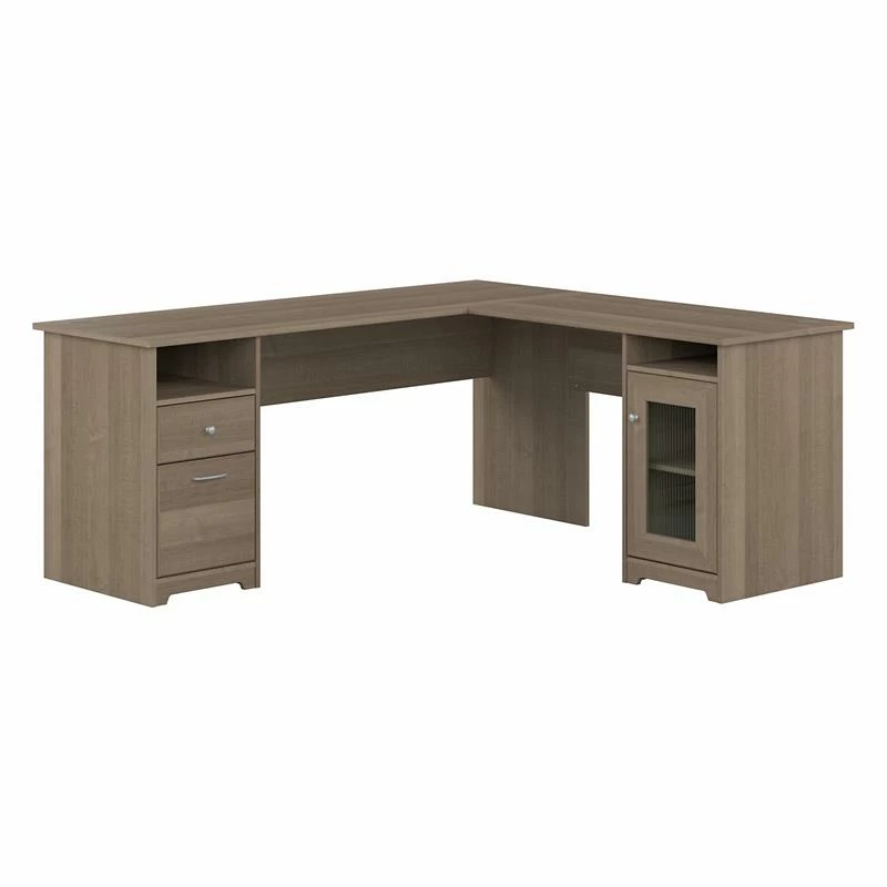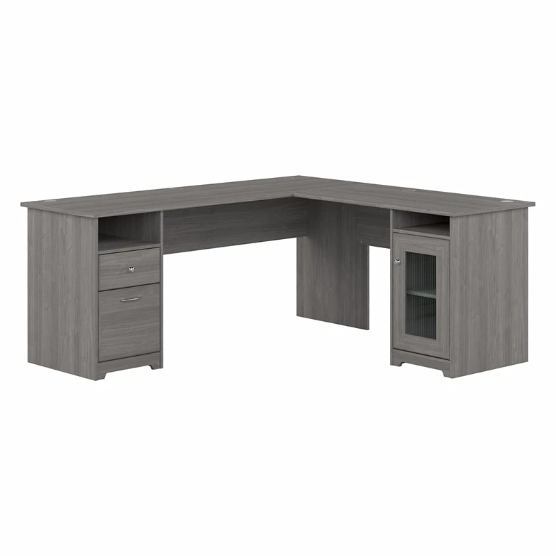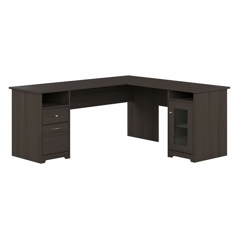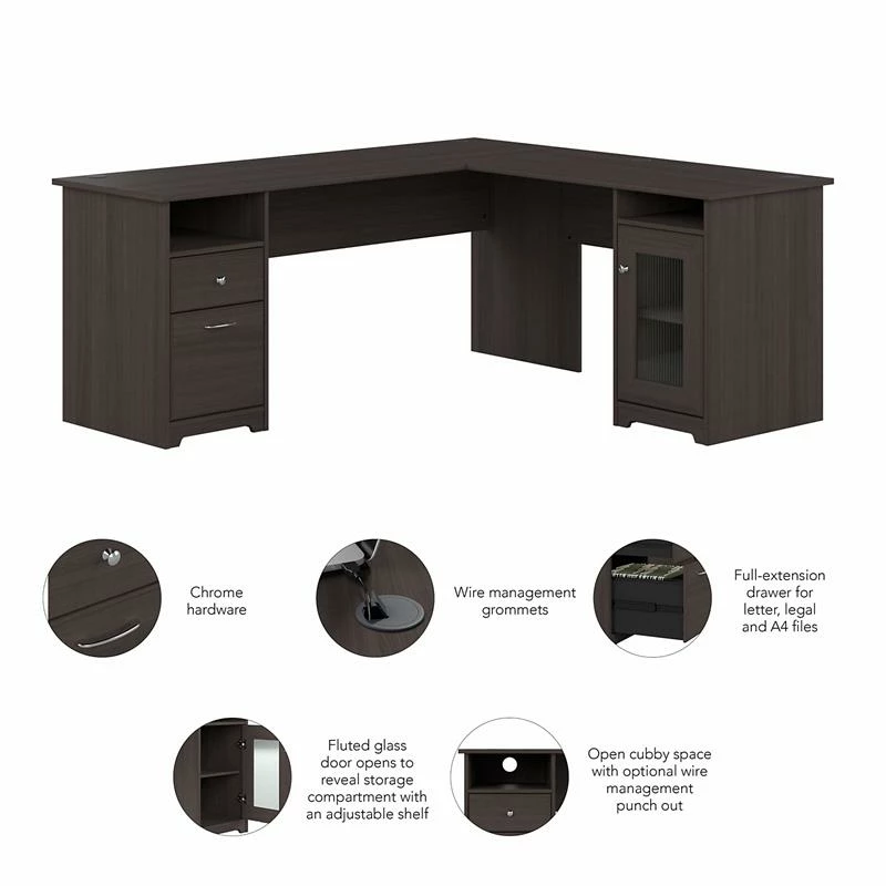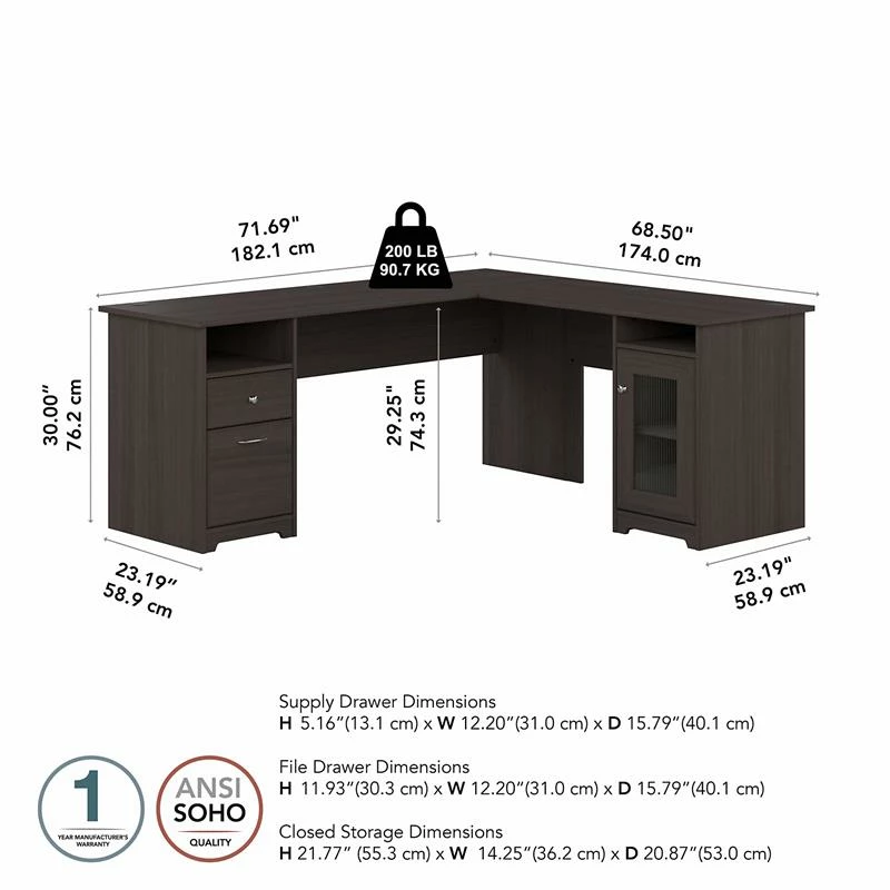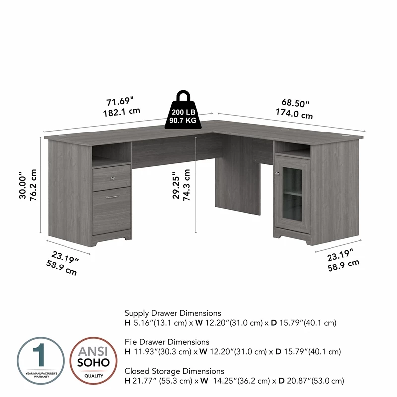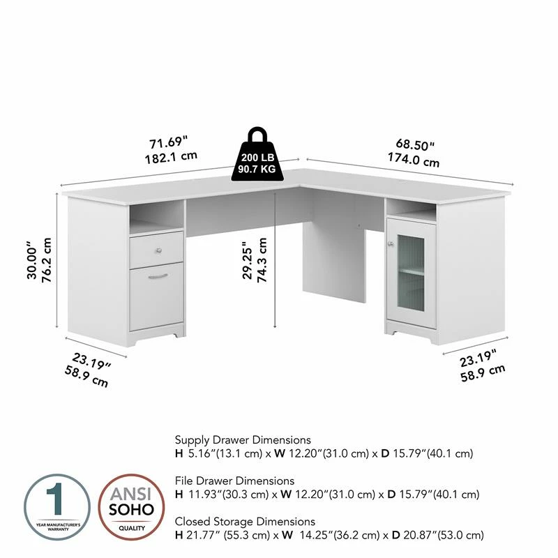 The Bush Furniture Cabot 72W L Shaped Computer Desk with Storage presents a home office solution with transitional style. Take advantage of the spacious 72-inch L Shaped Desk surface to spread out with all the materials you need for your next project or assignment. The durable desktop supports up to 200 pounds and includes built-in wire management to keep cords and cables out of the way. Organize materials and supplies inside a storage cabinet with an elegant fluted glass door. A file drawer opens on smooth full-extension ball bearing slides for an effortless reach to letter, legal, and A4-size paperwork. A box drawer and two open cubby spaces are perfect for work-in-progress and other frequently used items. This corner desk with drawers and storage cabinet has been rigorously tested to meet or exceed ANSI/SOHO standards for safety and performance and is backed by a 1 Year Warranty.
