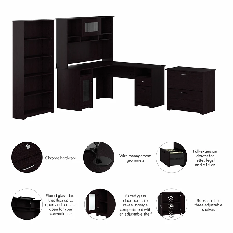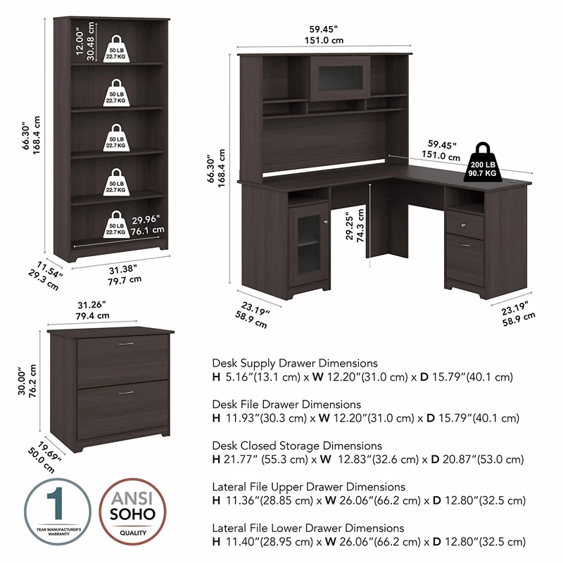 The Bush Furniture Cabot 60W L Shaped Computer Desk with Hutch, File Cabinet and Bookcase presents a home office solution with transitional style. The L Shaped Desk surface supports up to 200 pounds and includes built-in wire management to keep cords and cables out of the way. The Desk Hutch adds another closed compartment behind a fluted glass door along with right and left shelves for flexible storage and display. The lateral filing cabinet’s spacious drawers open on smooth full-extension ball bearing slides for an effortless reach to letter, legal, and A4-size documents. The Tall Bookcase includes three adjustable shelves for books and decorations of various sizes while two shelves are fixed for stability. This corner desk with file cabinet and bookshelf set has been rigorously tested to meet or exceed ANSI/SOHO standards for safety and performance and is backed by a 1 Year Warranty.