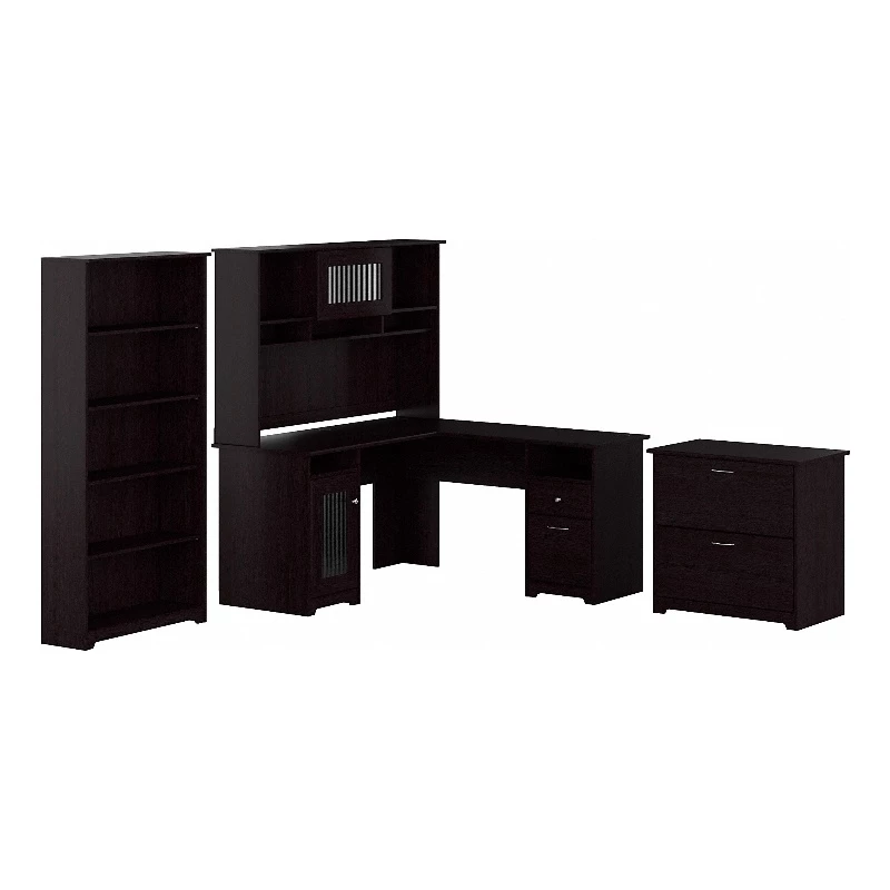 - Bundle includes: 60W L Shaped Computer Desk with Storage, 60W Desk Hutch, 2 Drawer Lateral File Cabinet, Tall 5 Shelf Bookcase