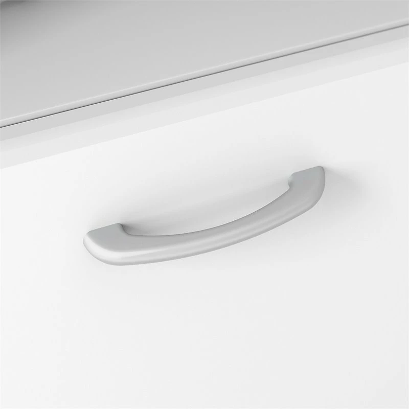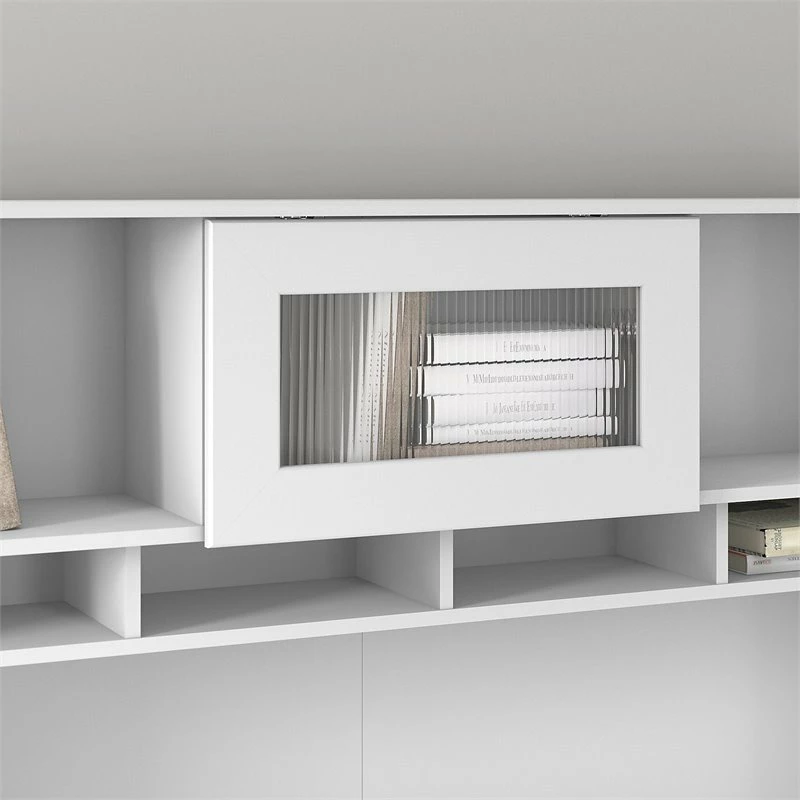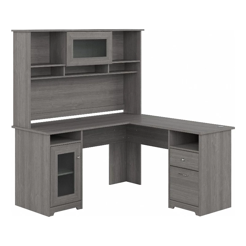 The Bush Furniture Cabot 60W L Shaped Computer Desk with Hutch and Storage presents a home office solution with transitional style. The spacious L Shaped Desk surface supports up to 200 pounds and includes built-in wire management to keep cords and cables out of the way. Organize materials and supplies inside a storage cabinet that contains one adjustable shelf. The file drawer opens on smooth full-extension ball bearing slides for an effortless reach to letter, legal, and A4-size paperwork while a smaller box drawer keeps small office supplies in order. The Desk Hutch adds another closed compartment behind a fluted glass door along with right and left shelves for flexible storage and display. The Cabot 60 “ L shape desks and hutch the hutch can be mounted on the right or left . This corner desk with drawers, storage cabinet, and hutch has been rigorously tested to meet or exceed ANSI/SOHO quality standards for safety and performance and is backed by a 1 Year Warranty.