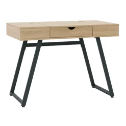 The perfect combination of modern style and functional features, the Rockdale Laptop Multi-Compartment Laptop Desk with Charging Station offers storage solutions and a built-in power supply strip to keep your laptop, phone, and other accessories charged. Designed for small spaces, this office desk has a drawer and tops that lift so you can store items to clear your workspace. The hinges on these storage compartments are soft-close for safety. Cord management holes allow you to organize and run your power cords to the USB and 3-prong power outlets in the back compartment. Cutouts on the lifting tops make them easy to maneuver. The powder-coated metal and durable vinyl laminate tops are scratch-resistant. Ideal as a standard writing desk or laptop computer, this desk is available in Honey Maple or Shorecrest Grey.